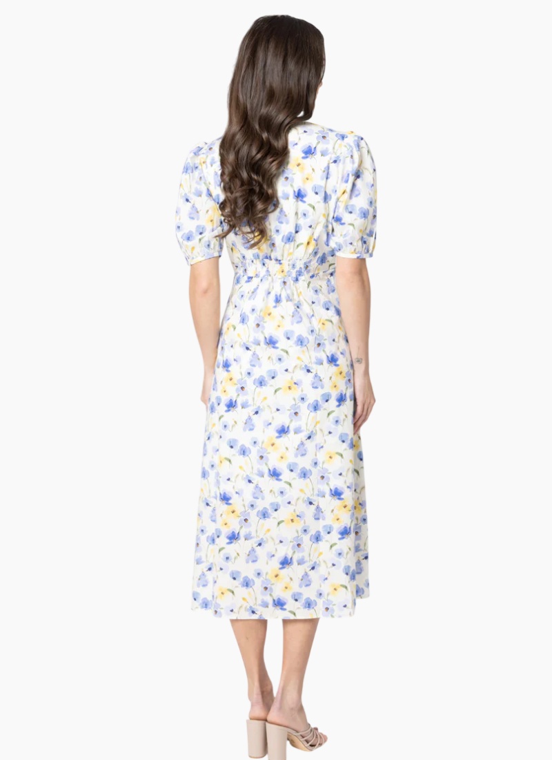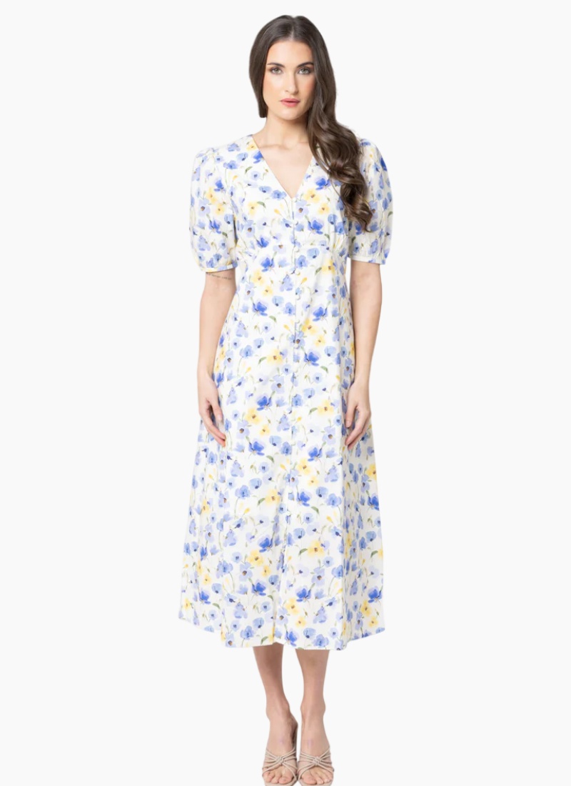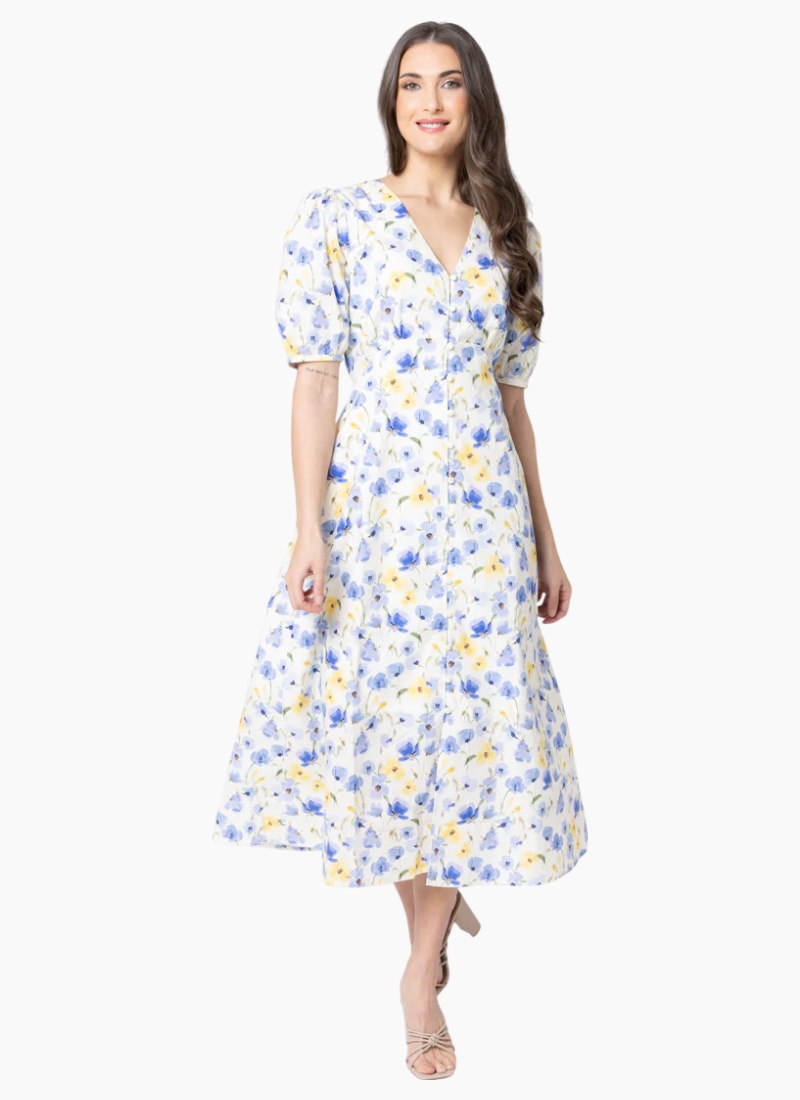 Introducing the Cheerful Dress from Seeking Lola. This inviting floral midi captures fresh, feminine style with a flattering V-neck and soft puff sleeves.
