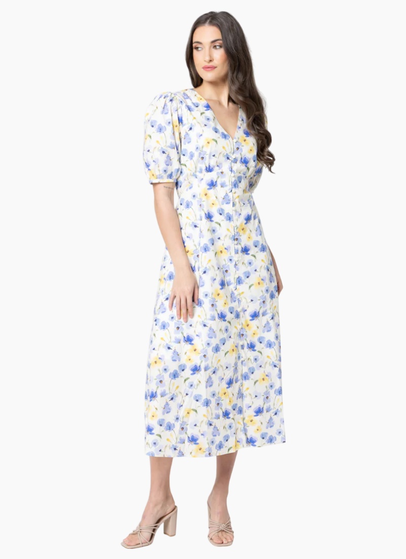 - Puff sleeves and a mid-calf length add a vintage-inspired, romantic touch