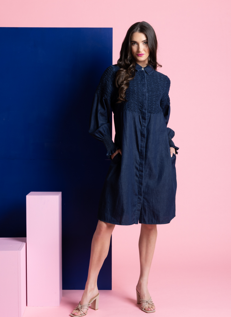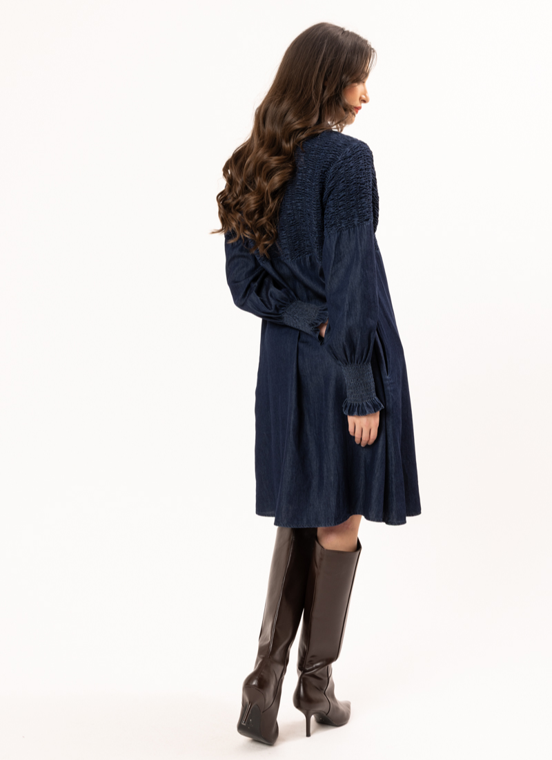 Elevate your everyday wardrobe with the Cheri Dress, a sophisticated take on classic denim. This piece features intricate shirred detailing across the bodice and back, blending structured style with feminine texture. With its rich indigo wash and dramatic blouson sleeves, it’s the perfect effortless statement piece.Design Highlights Intricate Shirring: Smocked detailing across the chest, shoulders, and back. Statement Sleeves: Voluminous blouson sleeves finished with tall, ruffled shirred cuffs. Classic Details: Traditional collar with a full-length button-down front. Functional Fit: A relaxed silhouette featuring discreet side pockets. Composition: 100% Cotton Denim. Care: Cold, gentle machine wash separately and inside out (dark washes can omit dye for sometime; line dry in shade.