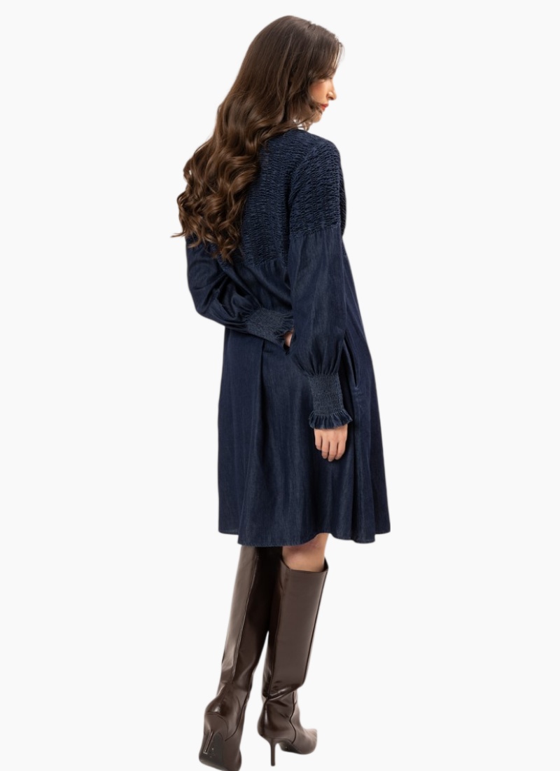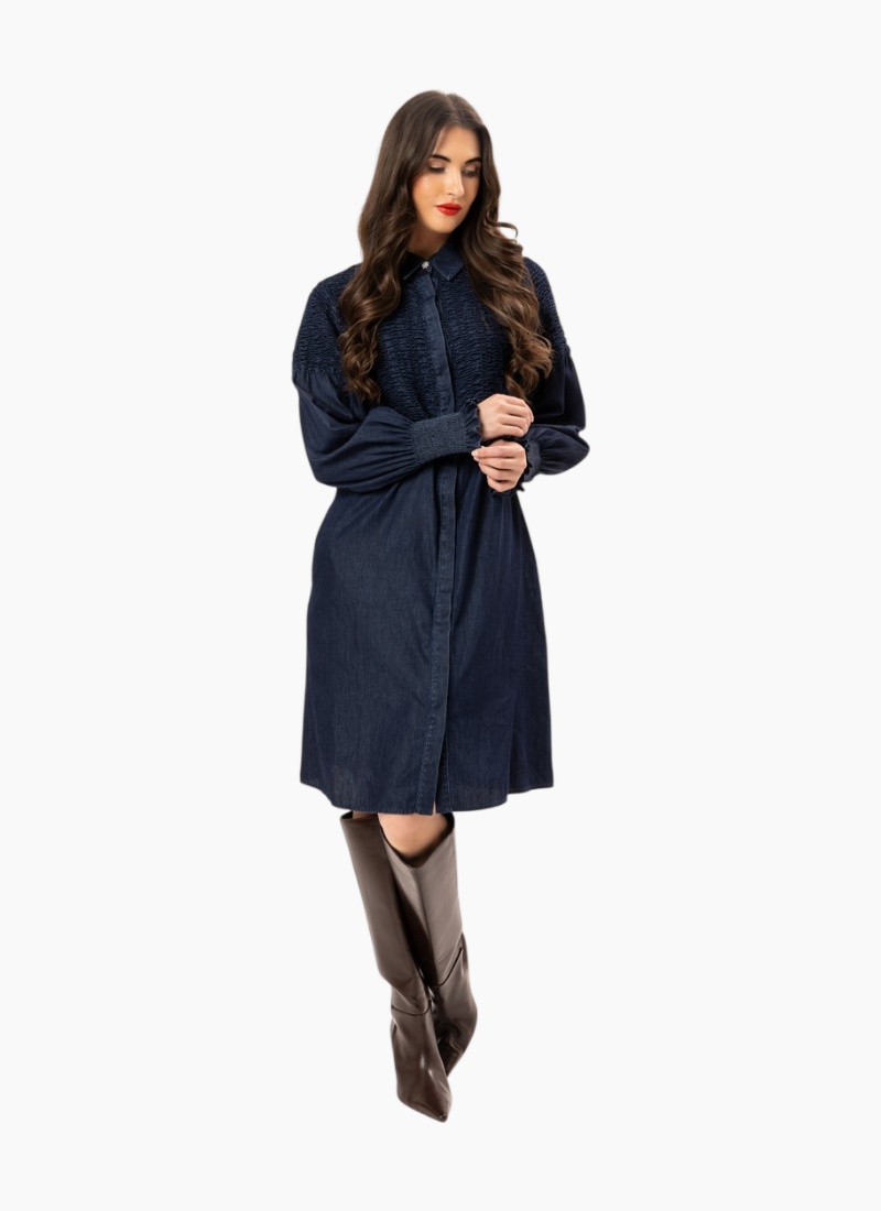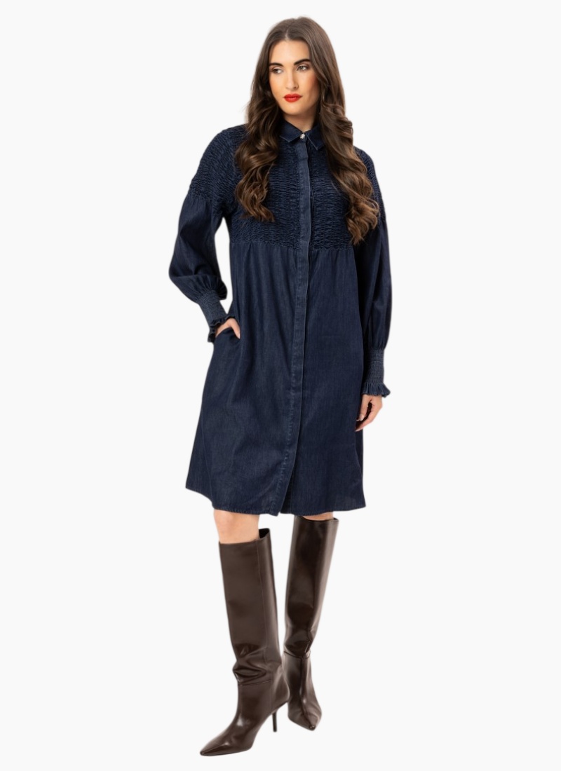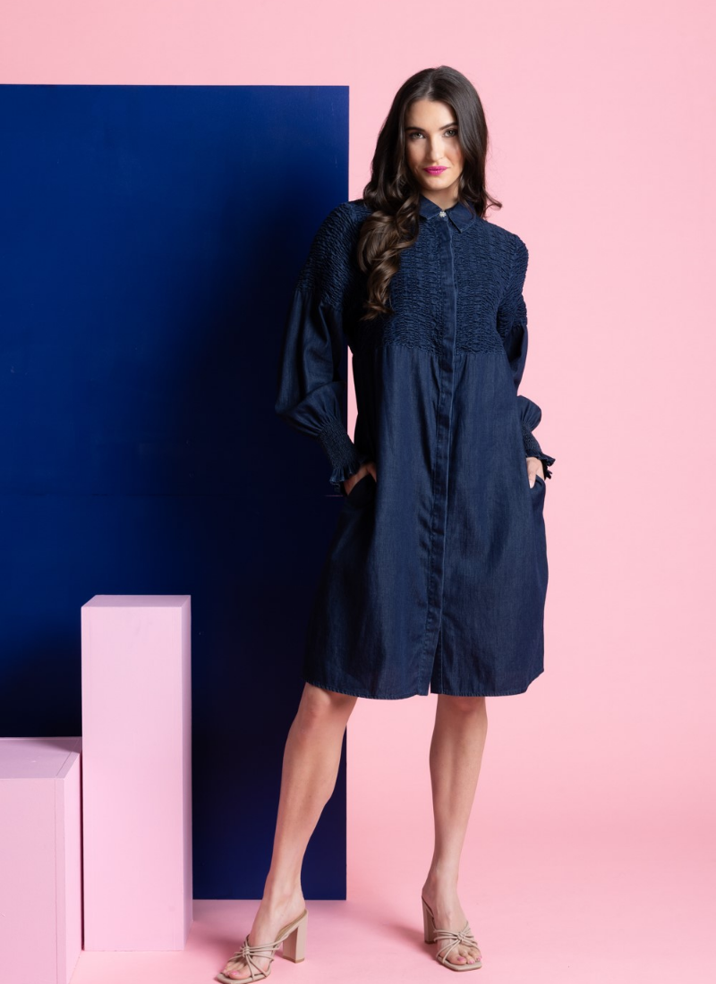 Elevate your everyday wardrobe with the Cheri Dress, a sophisticated take on classic denim. This piece features intricate shirred detailing across the bodice and back, blending structured style with feminine texture. With its rich indigo wash and dramatic blouson sleeves, it’s the perfect effortless statement piece. Intricate Shirring: Smocked detailing across the chest, shoulders, and back. Statement Sleeves: Voluminous blouson sleeves finished with tall, ruffled shirred cuffs. Classic Details: Traditional collar with a full-length button-down front. Functional Fit: A relaxed silhouette featuring discreet side pockets. Composition: 100% Cotton Denim.