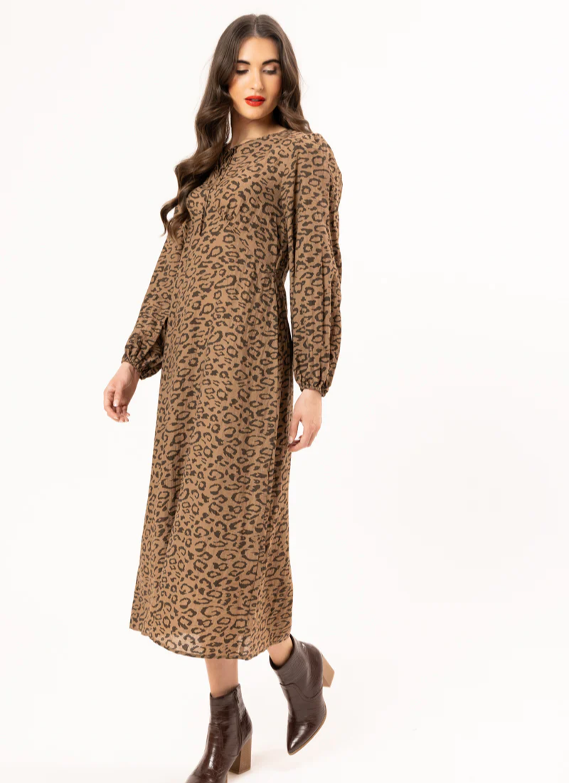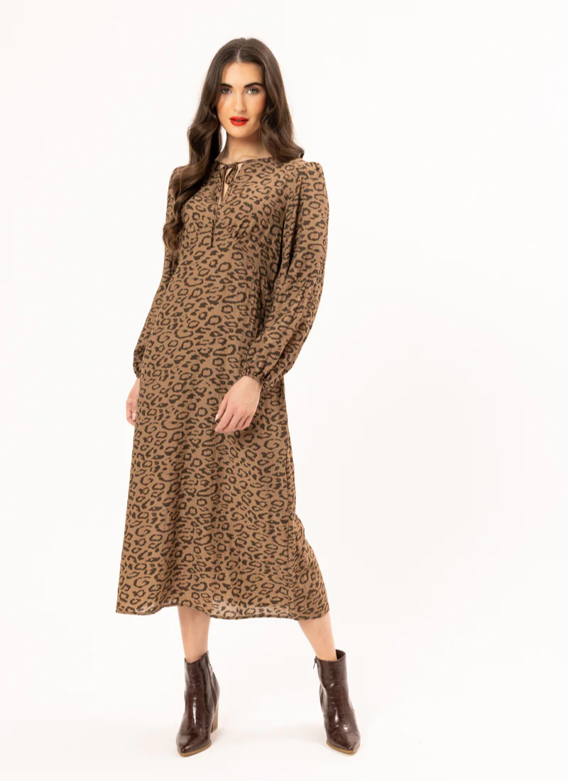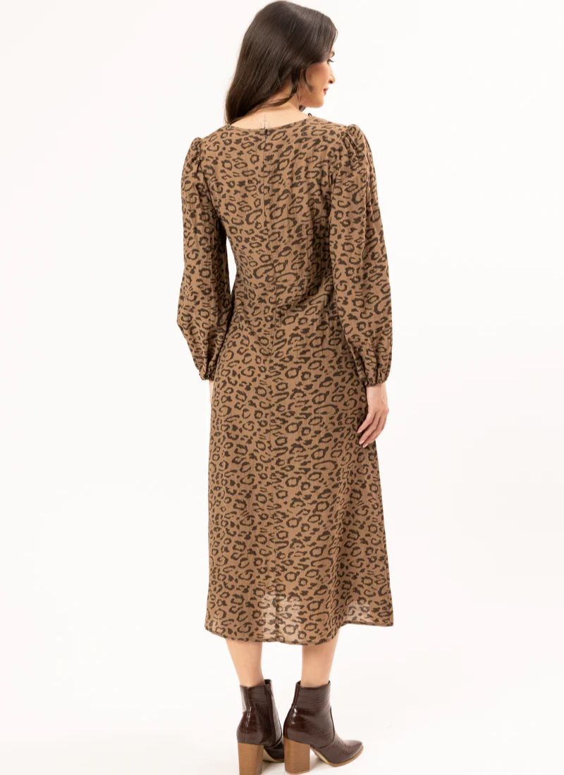 Introducing the Elegant Dress in Oak Cheeter from Seeking Lola. This tan leopard-print midi is a refined take on everyday glamour.