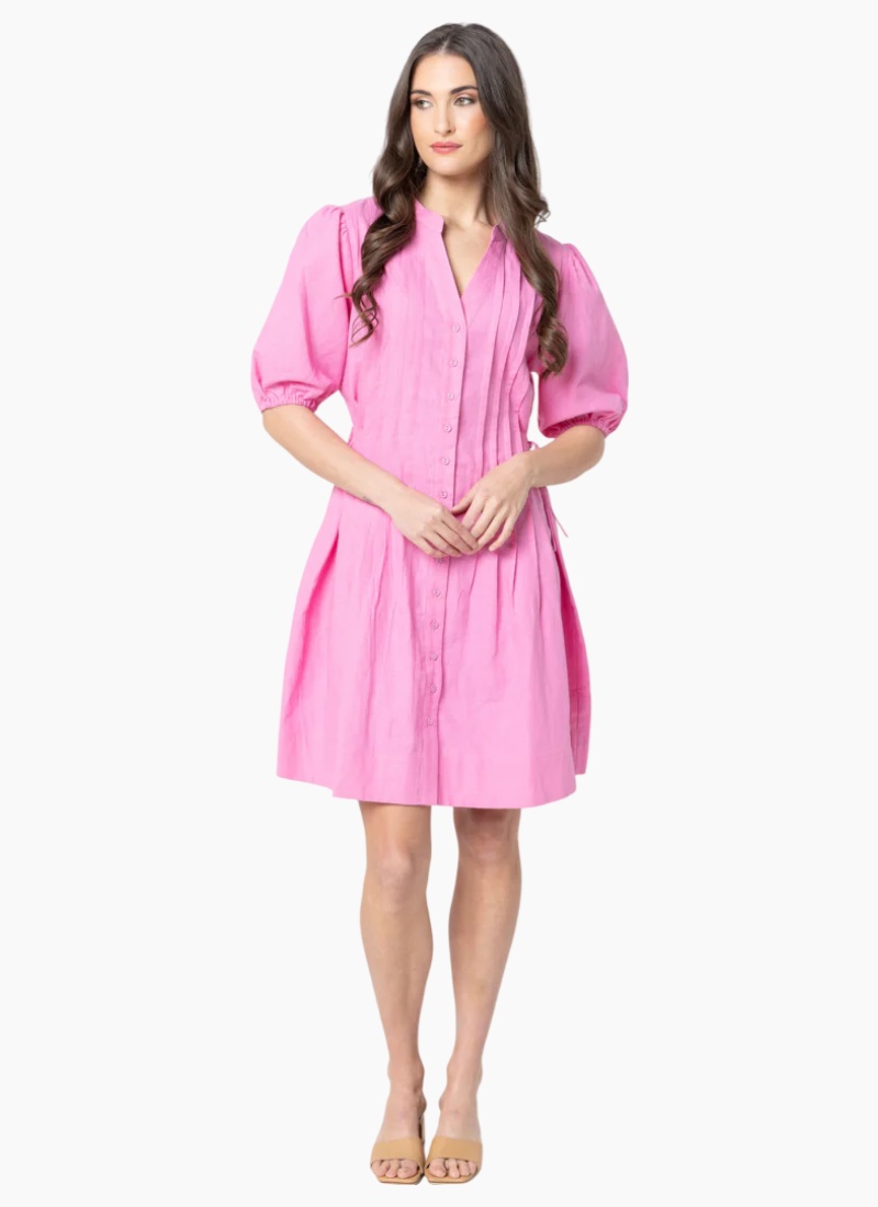 Introducing the INDULGENT SHIRT DRESS-BUBBLEGUM from Seeking Lola. A playful shirt dress in a vibrant bubblegum pink that brings effortless charm to your daytime wardrobe.