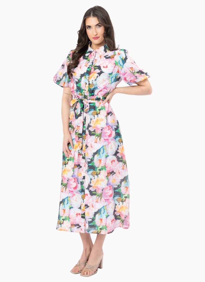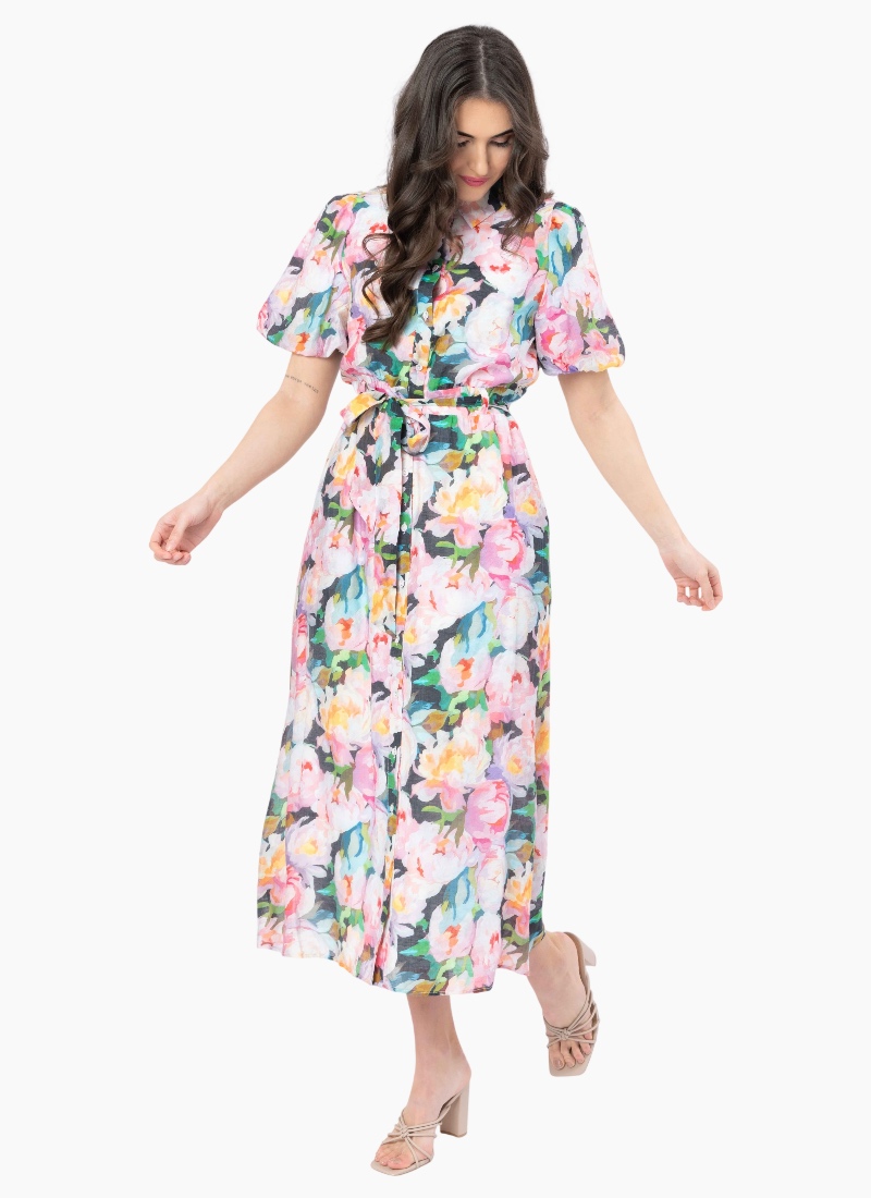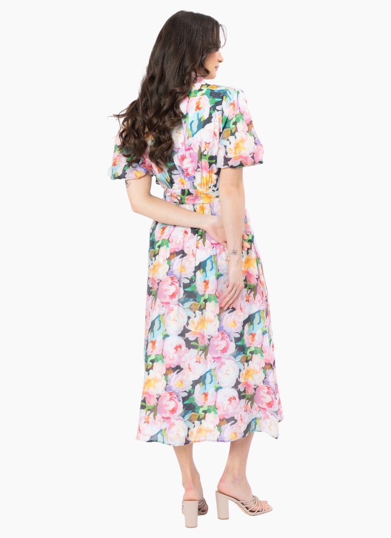 - Puff sleeves and a defined waist create a flattering silhouette with a flowing midi skirt