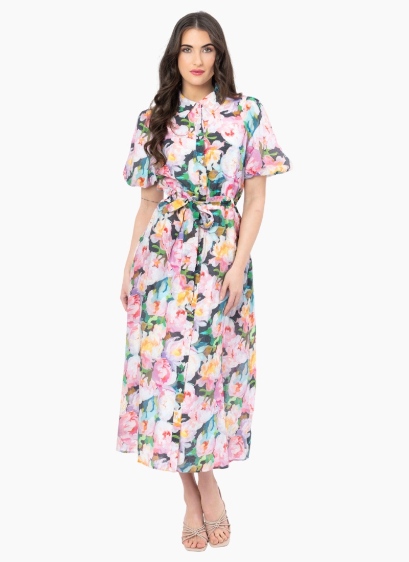 - Casual/Day Dresses silhouette with a defined waist, flowing mid-calf skirt and voluminous puff sleeves for a flattering, feminine shape