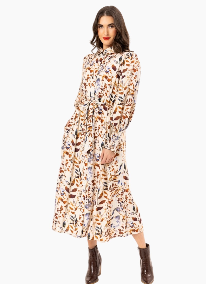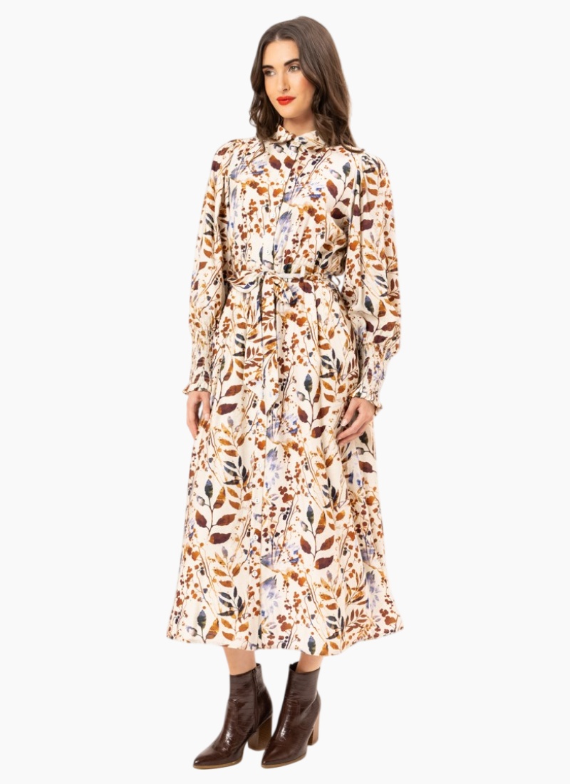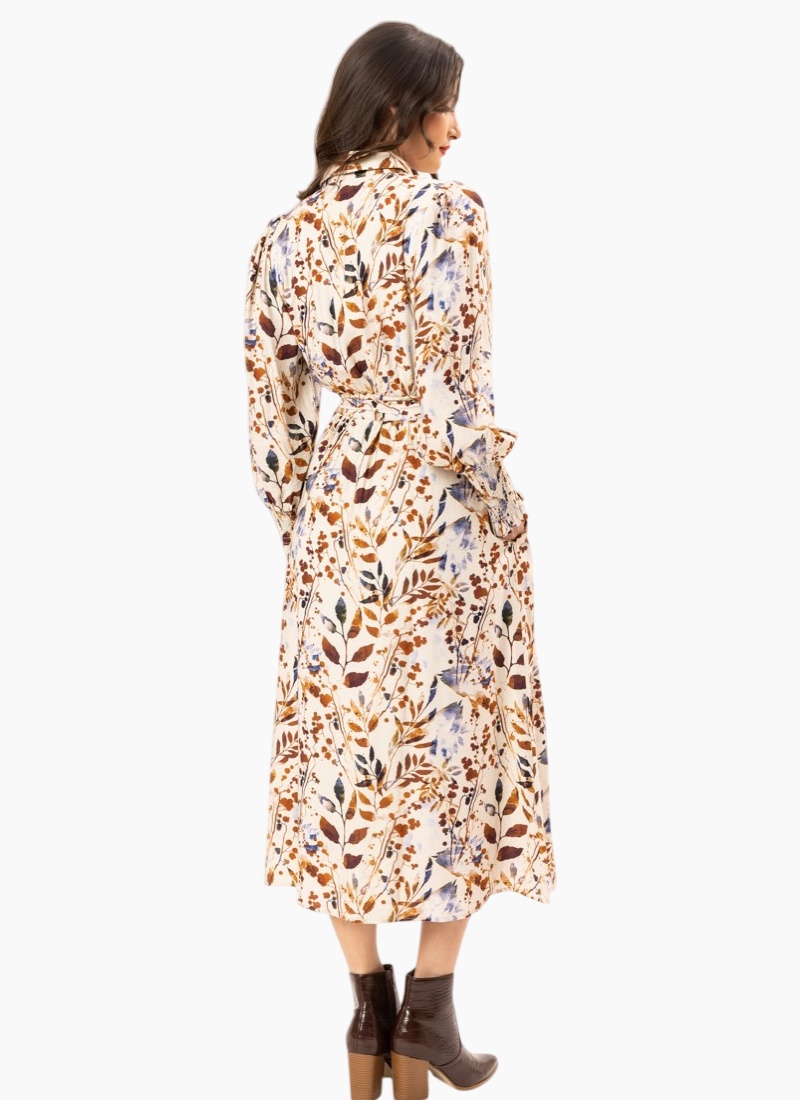 A smocked cuff sleeve frames this midi shirtdress covered in an enchanting floral print and centered with a belt to shape the silhouette.