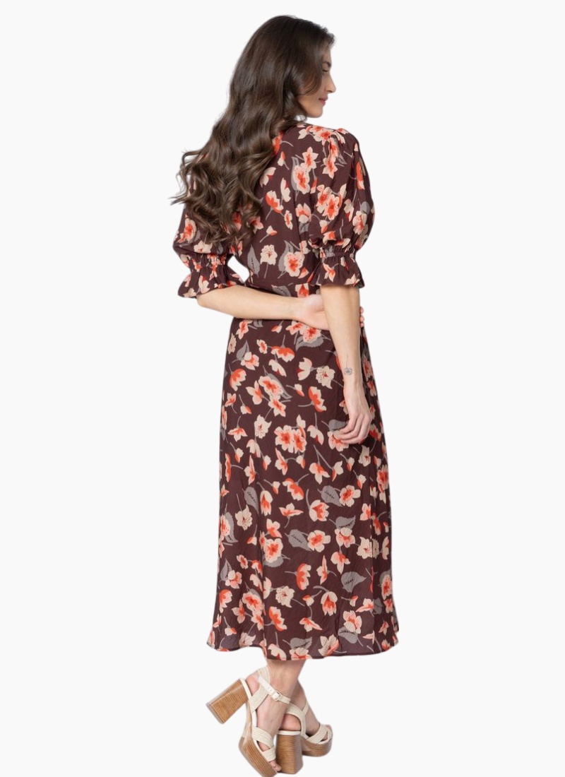 Introducing the Opportunity Dress in Nutmeg Glow from Seeking Lola. This floral midi radiates relaxed, feminine charm with a soft drape and statement sleeves.