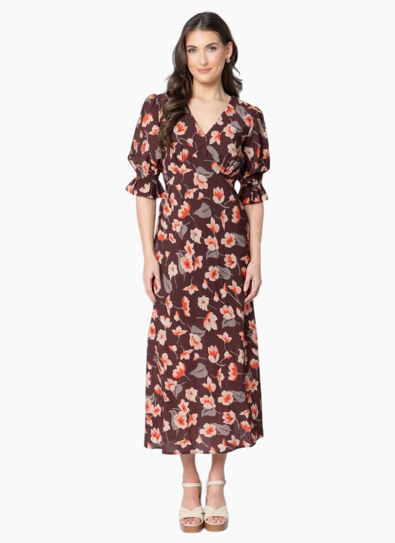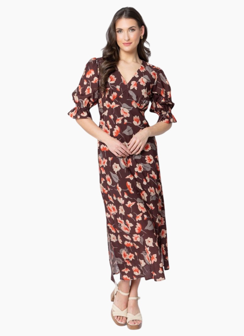 - Rich nutmeg colourway with warm peach and cream florals adds effortless elegance to daytime looks