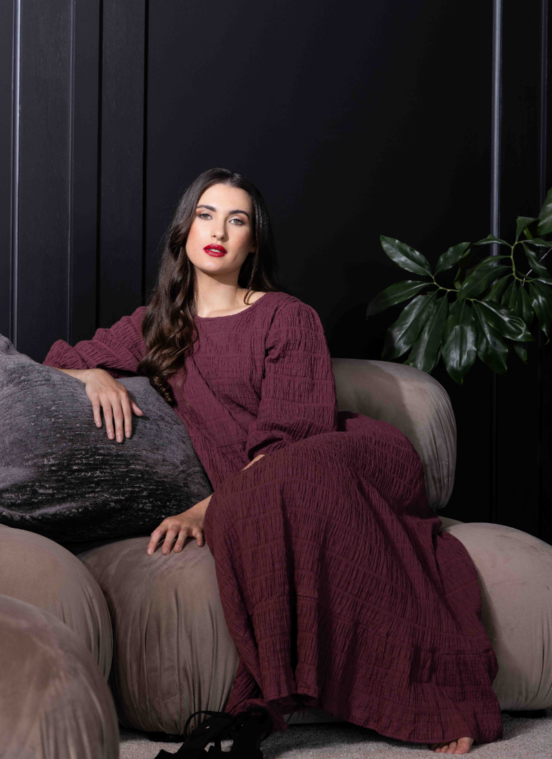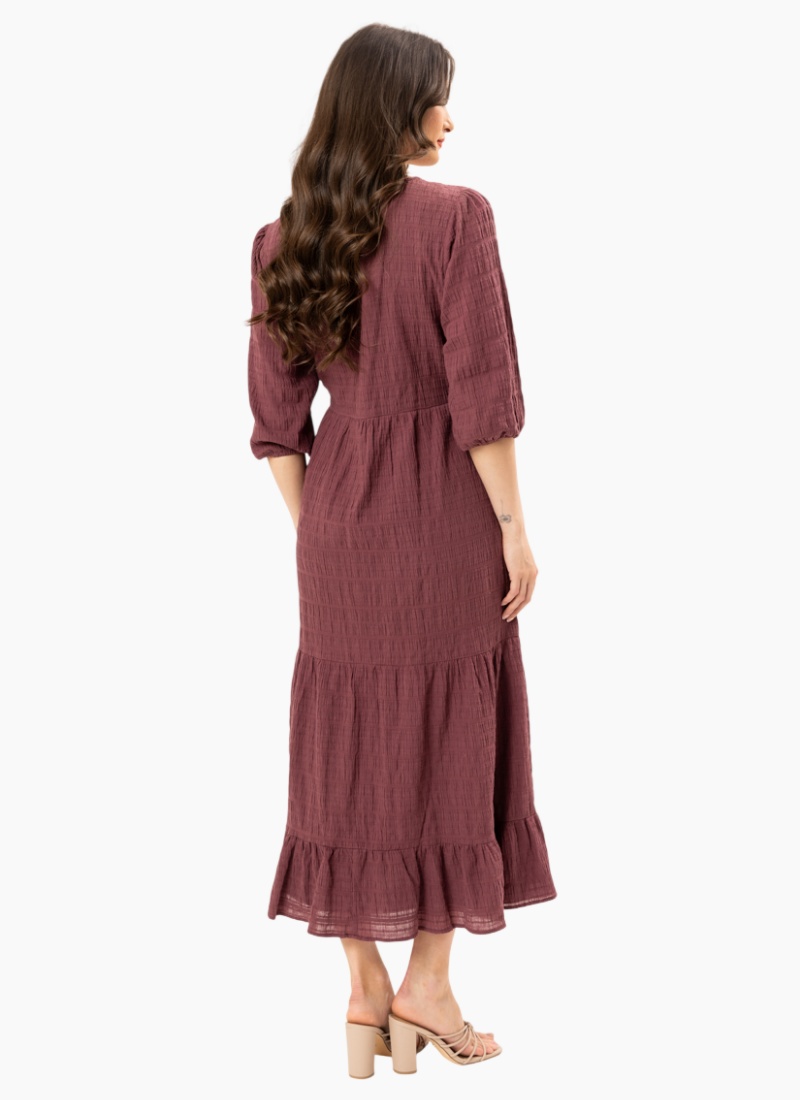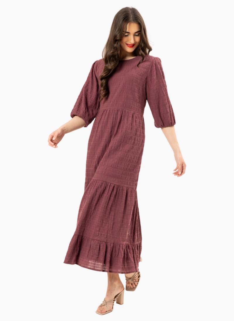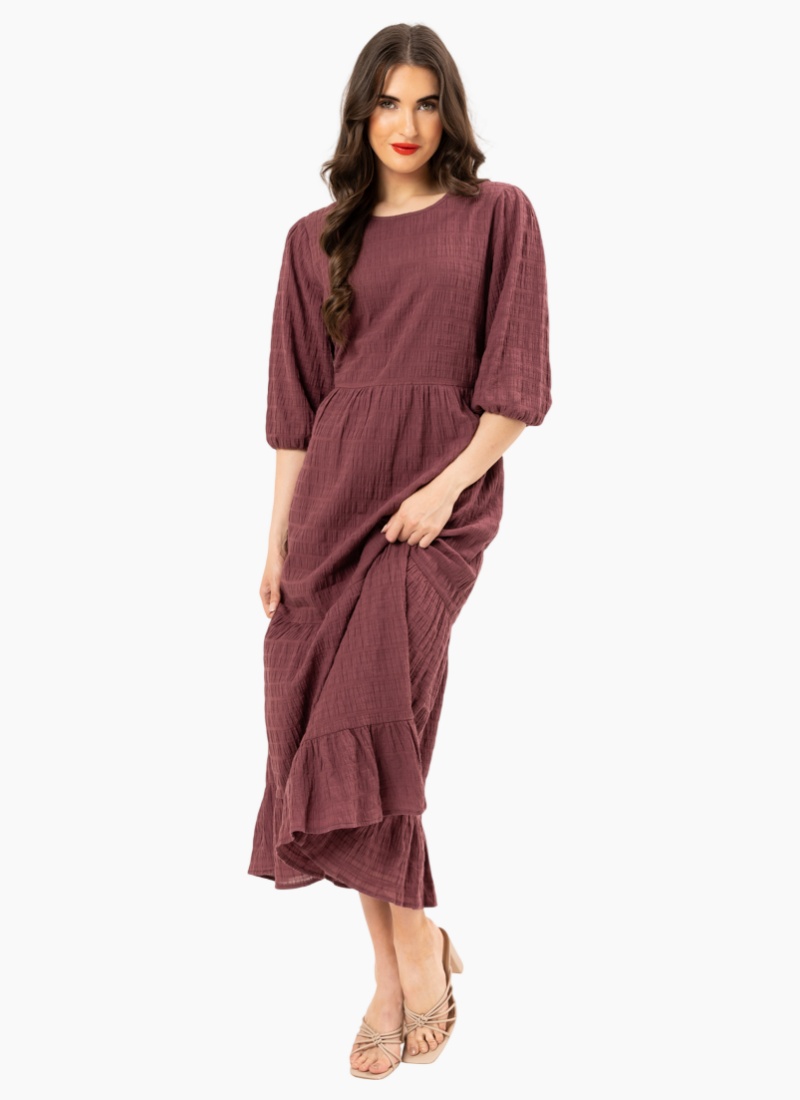 PRE ORDER DUE MARCH.Embrace effortless femininity with the Prairie Tiered Midi Dress. This piece is defined by its stunning Rosewood hue and a unique crinkle-texture fabric that adds depth and movement to the silhouette. With a flattering cinched waist and a flowing tiered skirt, it’s the ultimate "throw-on-and-go" dress for any occasion. Design Highlights Textured Crinkle Fabric: Crafted from a premium crinkle-finish material that offers a relaxed, tactile feel. Tiered Silhouette: A graceful midi-length skirt featuring tiered panels and a ruffled hem for added volume. Elegant Sleeves: Elbow-length blouson sleeves with soft elasticated cuffs. Refined Details: Classic round neckline and a high-waist seam to create a flattering shape. Care Instructions Color: Deep Rosewood. Fit: Standard fit with a flowing skirt. Care: Cold gentle machine wash; line dry in shade. No ironing required to maintain the signature crinkle texture.