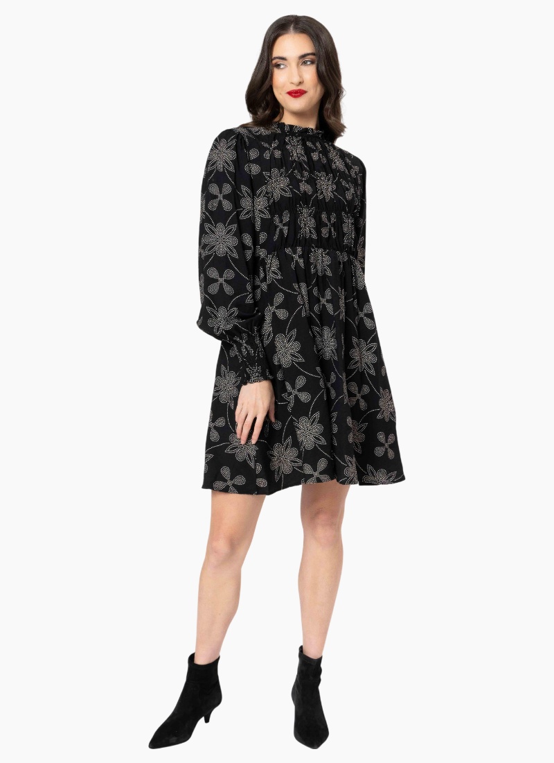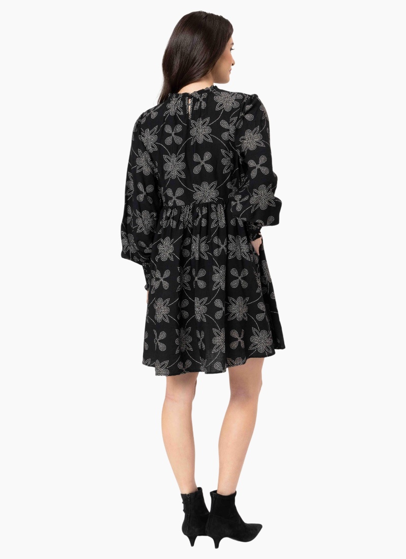 Introducing the Faithful Dress from Seeking Lola. This relaxed black dress features a delicate white floral print and a softly gathered skirt for effortless daytime style.