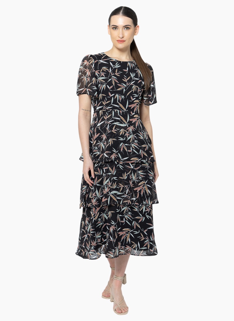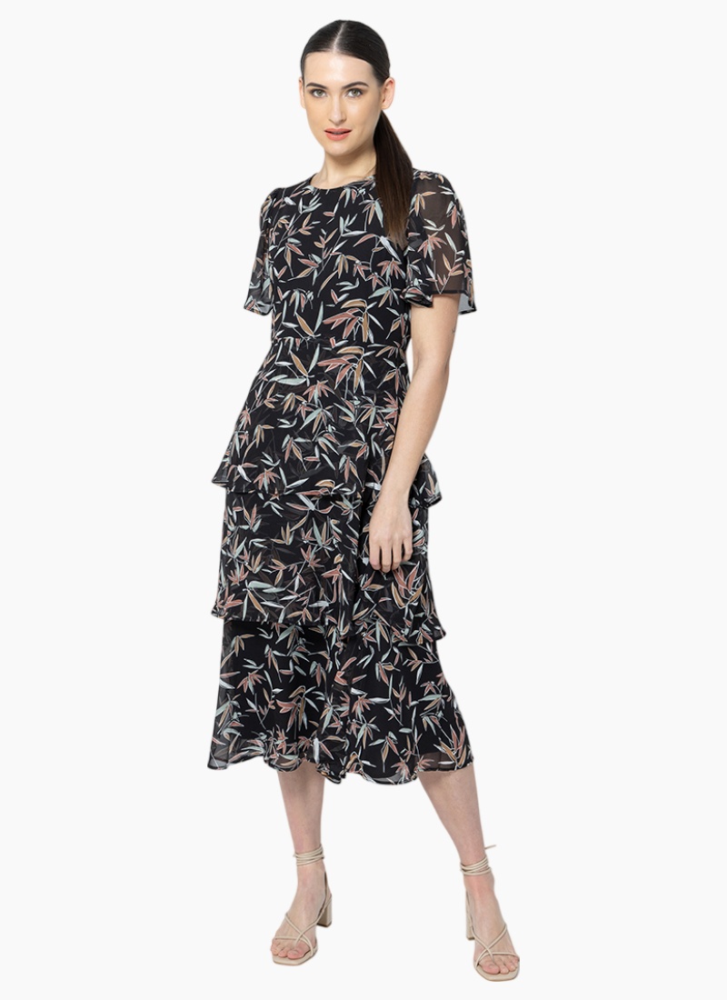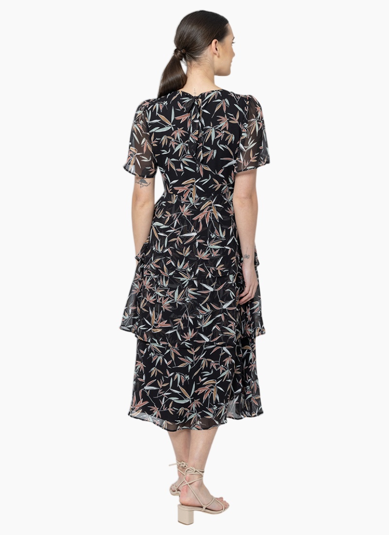 Introducing the Valiant Dress from Seeking Lola. This black, leaf-print chiffon dress is designed with soft tiers and flutter sleeves for effortless movement and timeless appeal.
