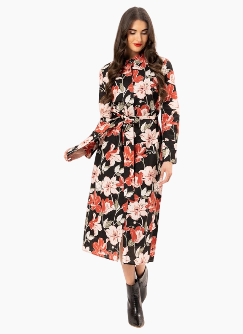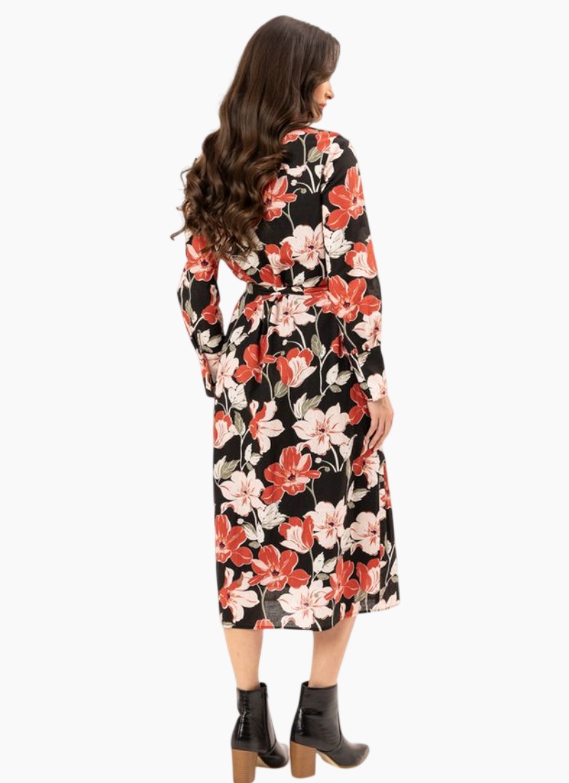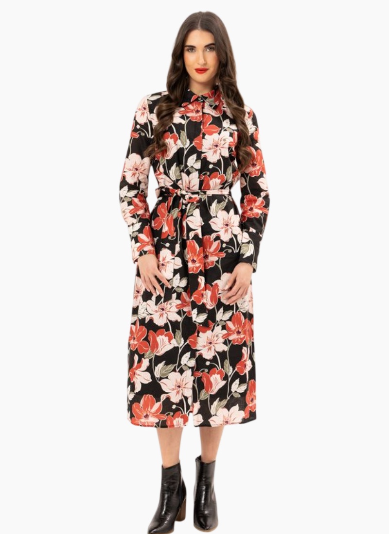 VIVA DRESS-ABUNDANCE This stunning piece features a button-through design adorned with laundry-covered buttons along the front, ensuring a polished look while maintaining practicality. The elasticized waist provides a flattering silhouette, complemented by a self-tie belt that allows for adjustable styling. The dress is designed with charming puff sleeves that add a touch of femininity, while the inclusion of pockets enhances its functionality. Fully lined for added comfort and quality 100% Cotton