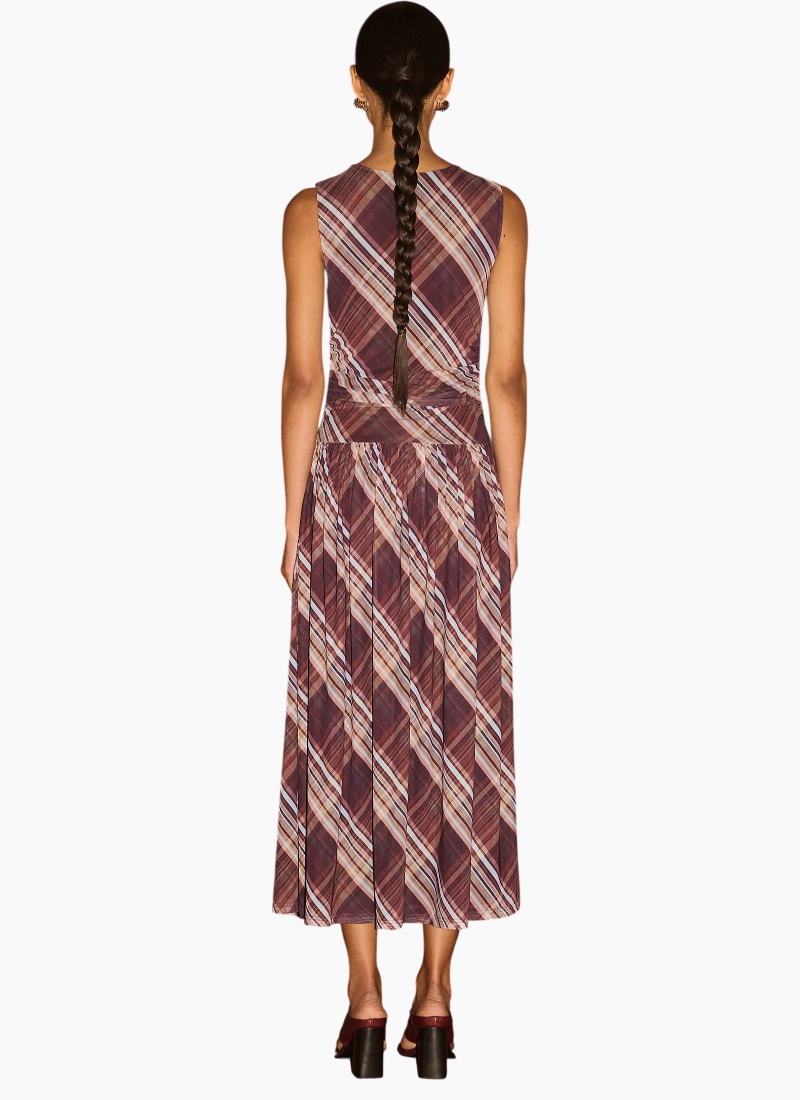 A modern take on a timeless print, the Plaid Mesh Midi Dress is designed to elevate your everyday wardrobe with ease. Featuring a softly structured silhouette, it’s fitted through the bodice before falling into a relaxed drop waist and fluid midi-length skirt. The diagonal plaid print adds subtle visual interest while keeping the look refined—perfect for workdays, weekends, and everything in between. Style with minimal sandals for an effortless daytime look, or elevate with heels for an easy day-to-night transition. Features Sleeveless midi dress Fitted bodice with drop waist seam Softly gathered skirt for natural movement All-over diagonal plaid print Lightweight fabrication with a soft drape Size & Fit Model is 178cm tall and wears a size Small Fabrication & Care Hand wash in cold water with similar colours Do not bleach Do not tumble dry Cool iron inside out Do not dry clean Additional Information Designed in Sydney, Australia