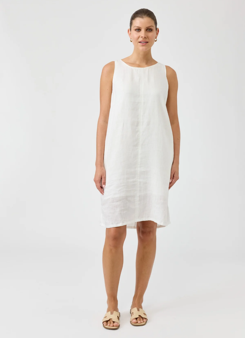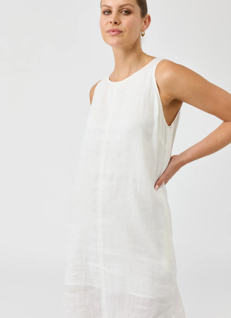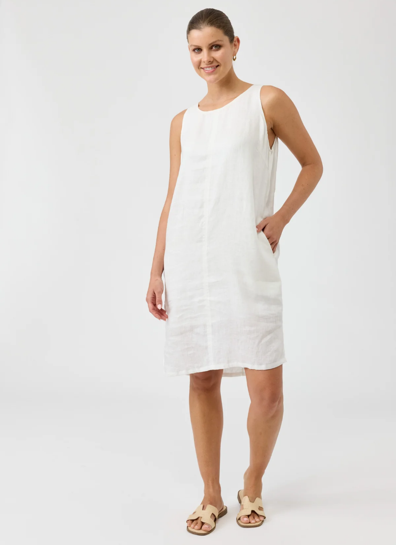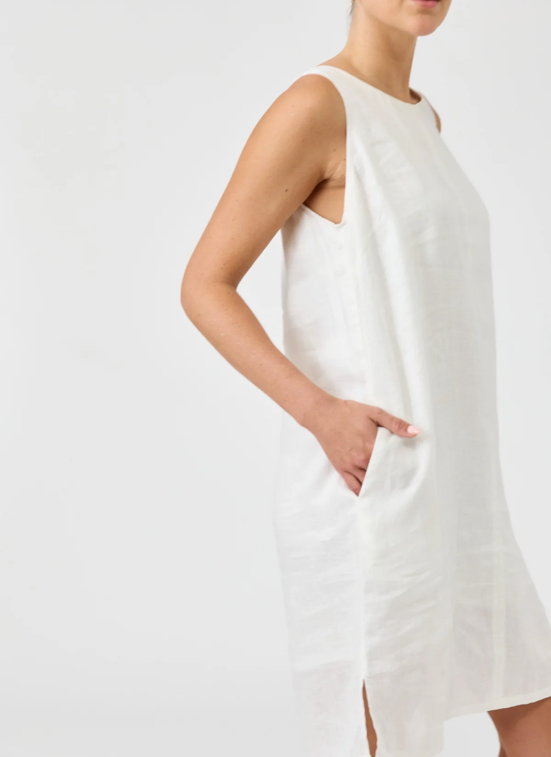 A timeless piece designed for effortless versatility. Crafted from 100% linen for breathable comfort with natural texture. Features a sleeveless A-line silhouette, functional side pockets, and subtle side slits for ease of movement. Fully lined for ease of wear. Falls to a flattering midi length. True to size for a softly structured shape.Style with sandals, slides, or sneakers for a fresh summer look that takes you from work to weekend. Crewneck A-line style Sleeveless Middle seam In-seam side pockets Midi-length Side vents Fully lined