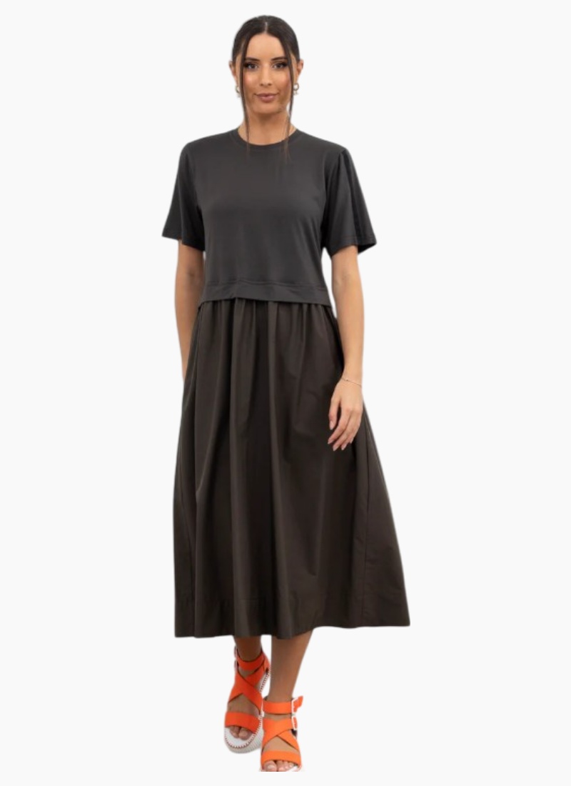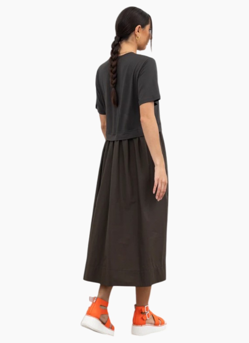 Introducing the That Way dress Olive from X Lab. This versatile piece blends a soft tee-style bodice with a full gathered skirt for an easy, polished daytime look.