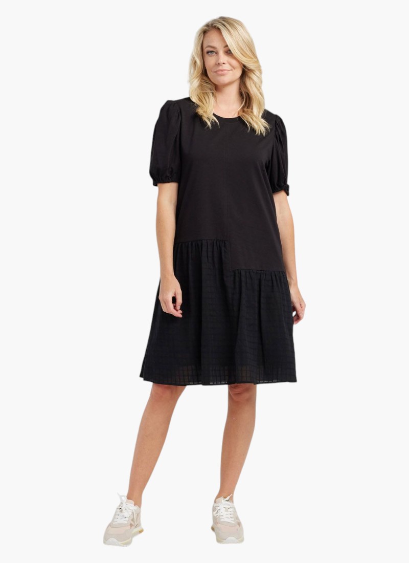 Knee-length t-shirt dress with charming puff sleeves and an asymmetrical bottom panel crafted from contrasting fabric, creating a fashionable and eye-catching look.