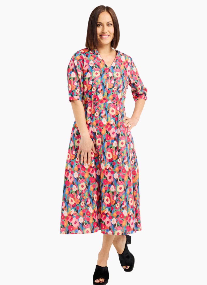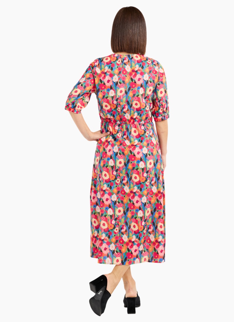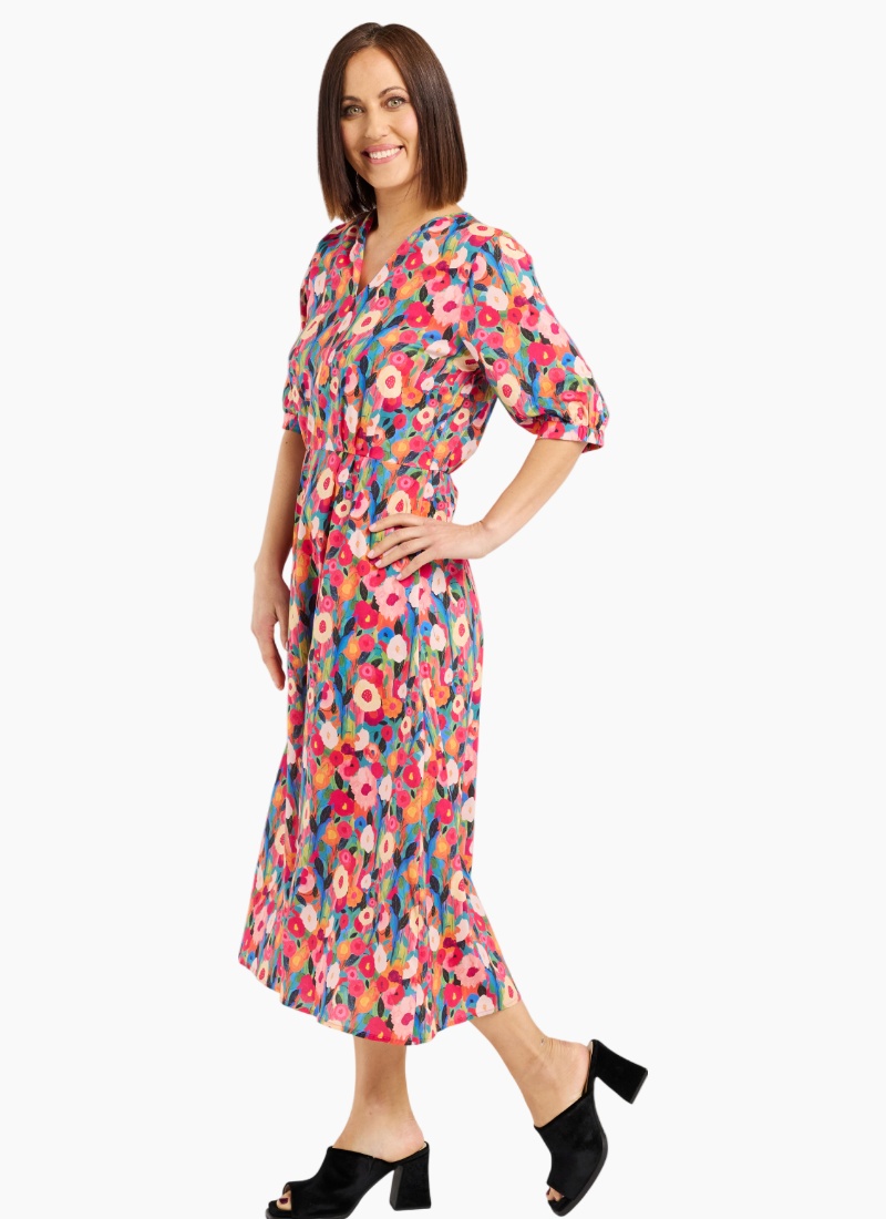 Introducing the Margot Dress from Zafina. A vibrant floral Casual/Day Dress that brings effortless polish to your daytime wardrobe.This V-neck dress bursts with a colorful floral print that radiates joy and energy. Features: Short sleeves Easy silhouette Perfect for warm-weather days