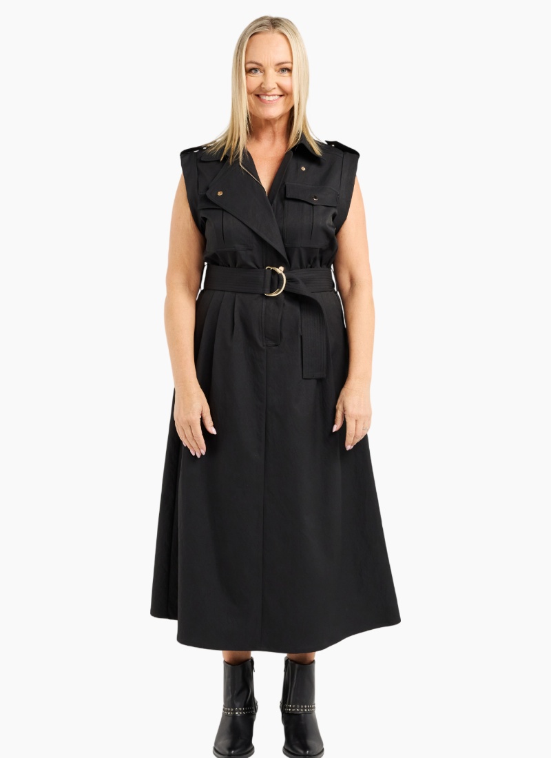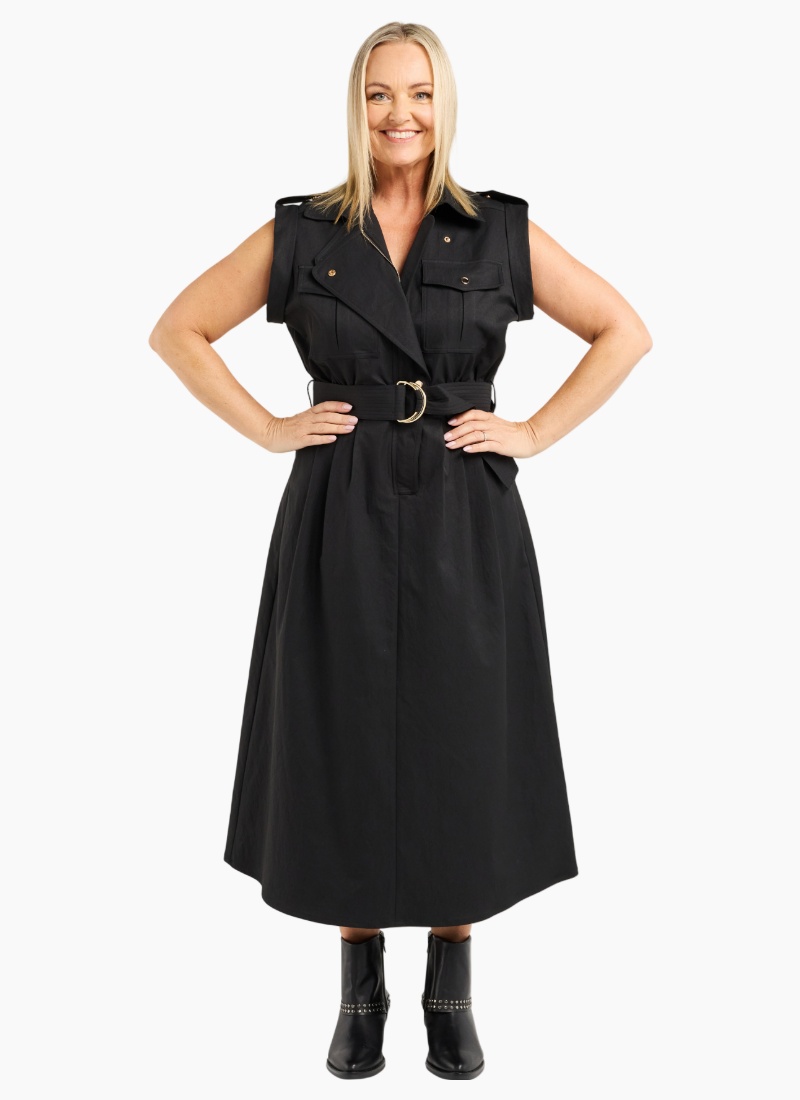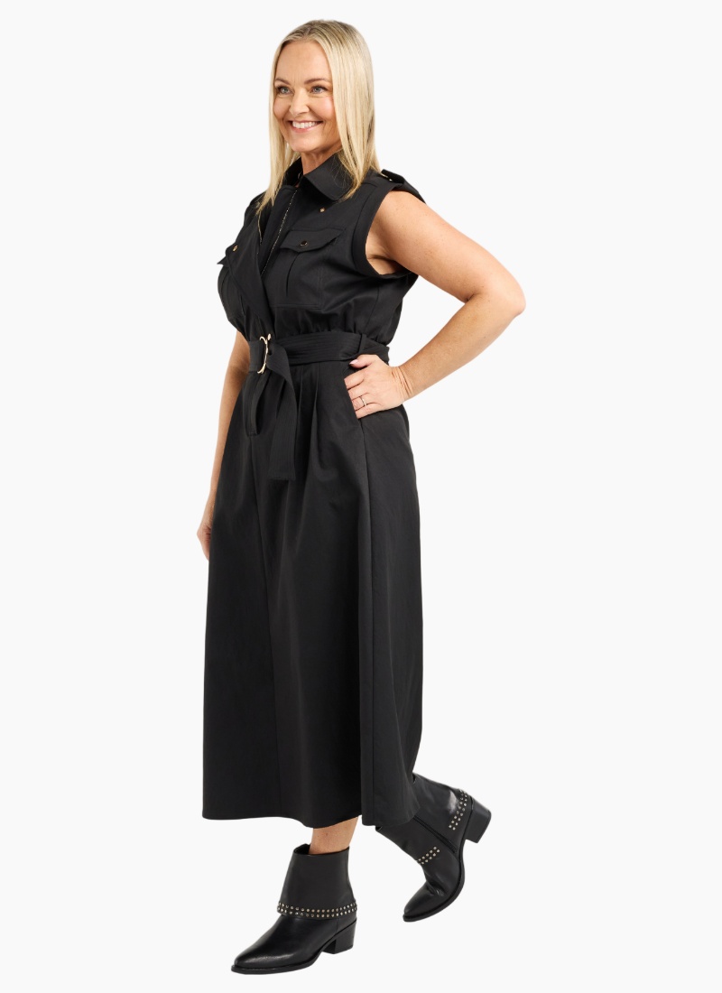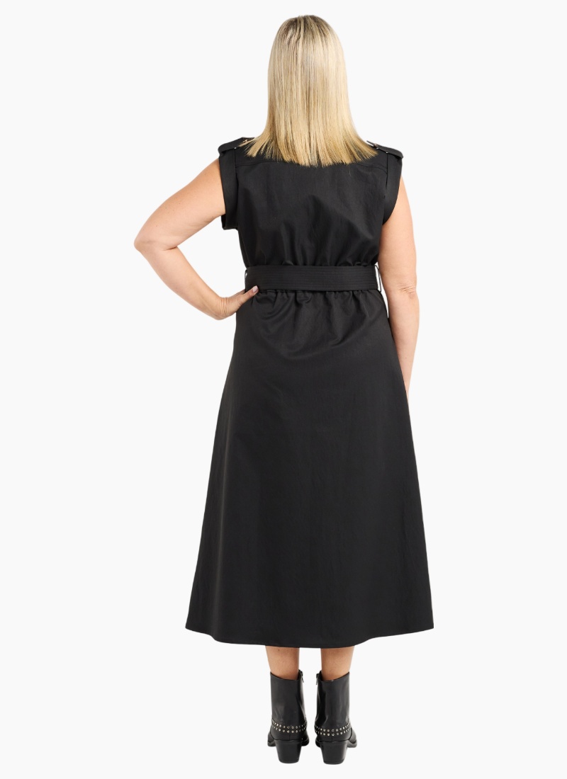 65% Viscose 35% Polyester This sleeveless black dress brings a modern edge with its collared bodice and subtle utility-inspired details. A matching belt shapes the waist for a sharp, flattering silhouette, and its versatile design lets you wear it on its own or layered over a top for added warmth. Cool, confident, and effortlessly stylish, it’s a standout piece for any winter wardrobe.