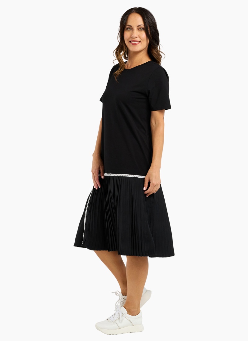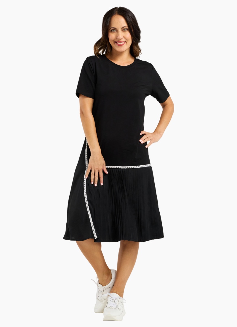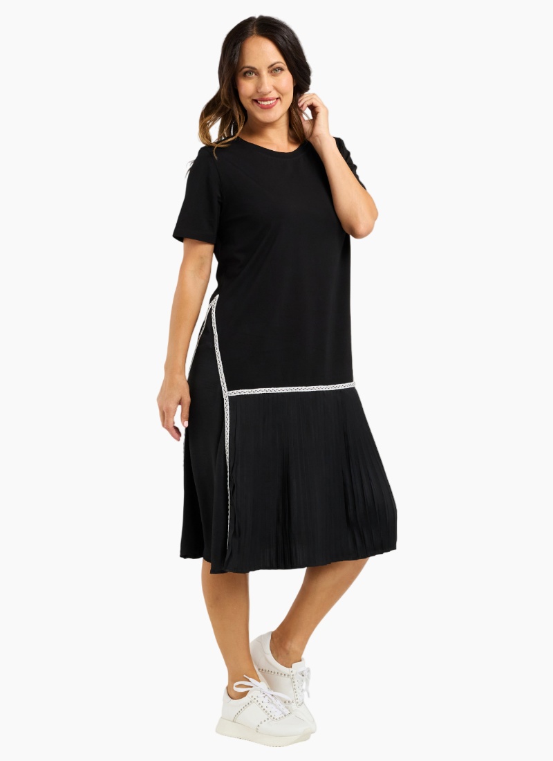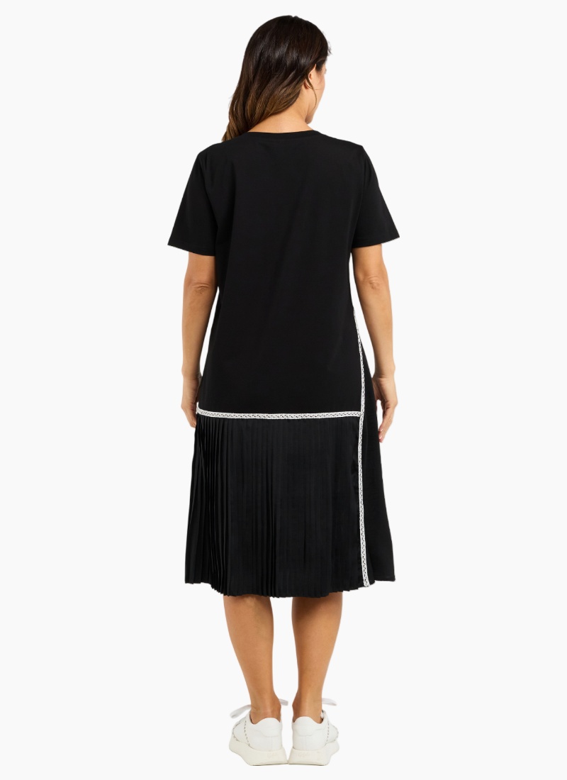 Elevated and refined, this black dress stands out with a pleated skirt panel and a fluid side split that moves beautifully. Luxurious white trims add contrast and polish, giving a modern edge to its thoughtfully designed silhouette.95% Cotton 5% Spx, Pleat hem 100% Polyester