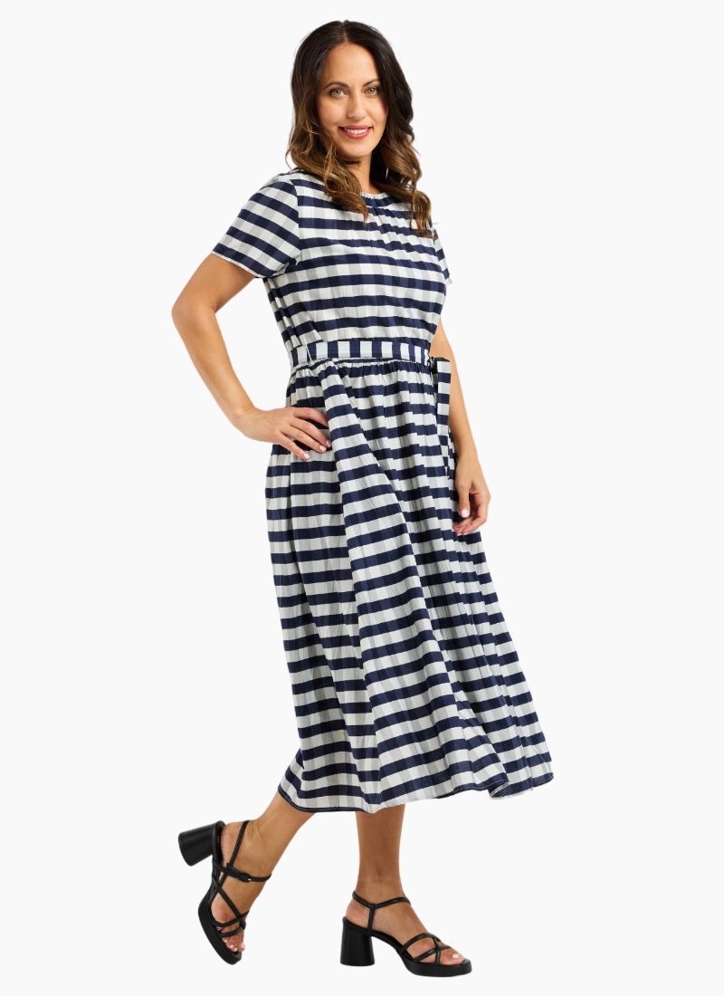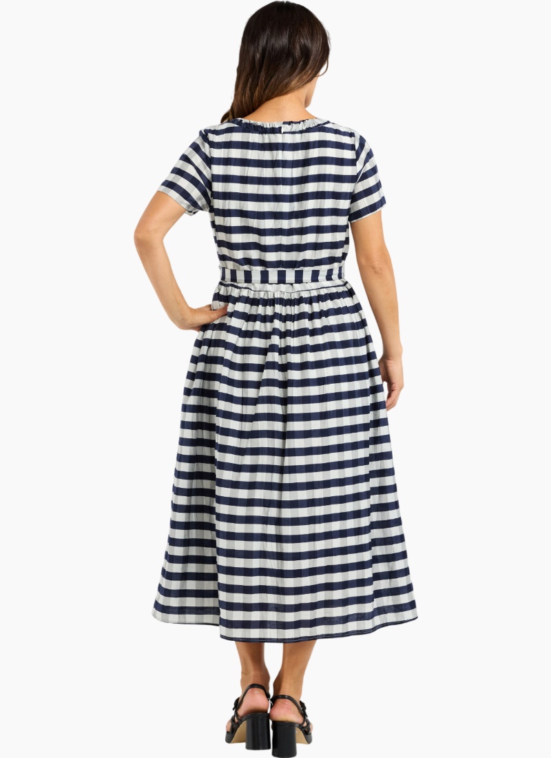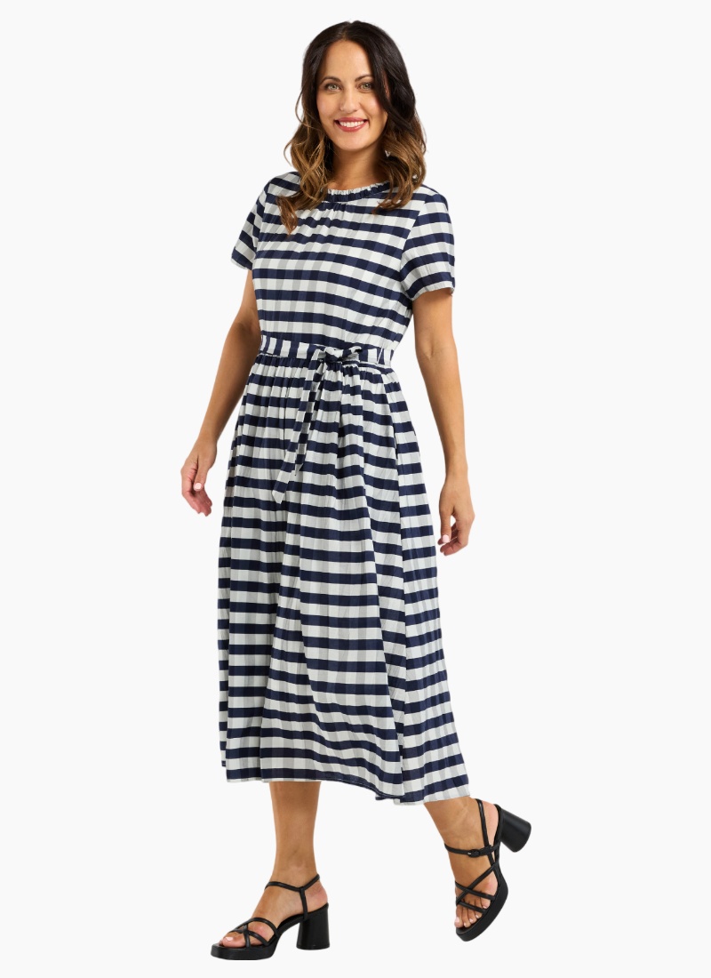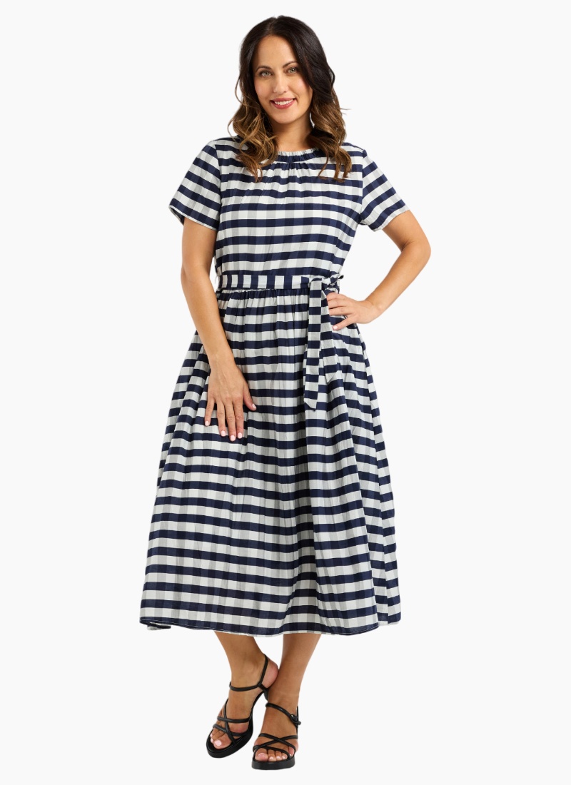 This easygoing yet chic dress features a round neckline and short sleeves, with an elasticated waist that can be cinched with a self-tie for a customized fit. The bold ink and white check pattern adds a contemporary twist to a classic silhouette.100% Cotton