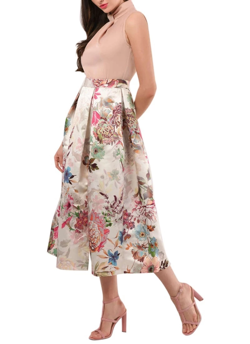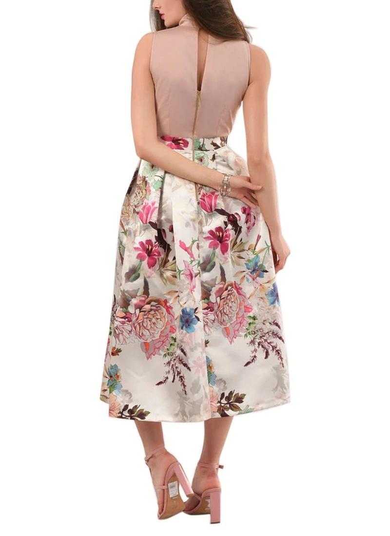 This pretty piece is a fresh take on classic occasion dress. It features a crisp and satin skirt decorated with a romantic faded rose print and an elegant blush coloured top with a chic knot detail at the neckline. It is perfect for any special occasion