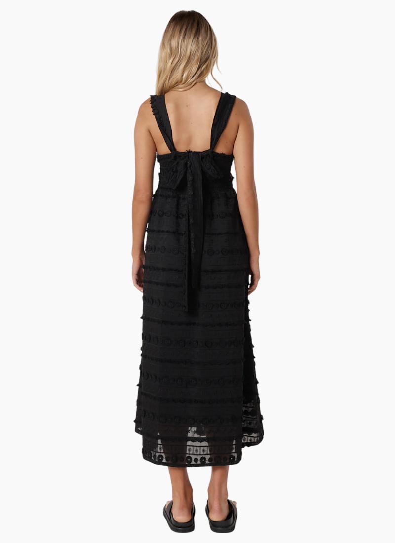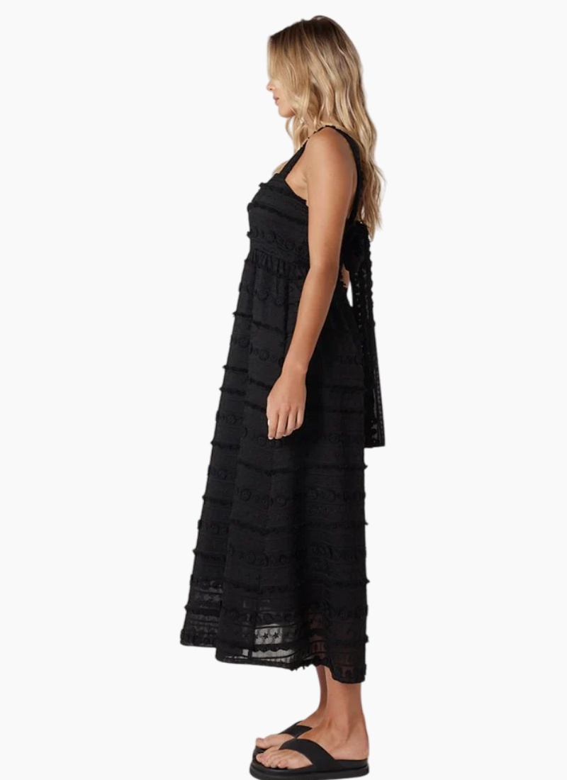 Introducing the SIERRA LACE DRESS-BLACK from Fate + Becker. This black lace dress combines intricate embroidered texture with a flattering, feminine silhouette ideal for evening occasions.
