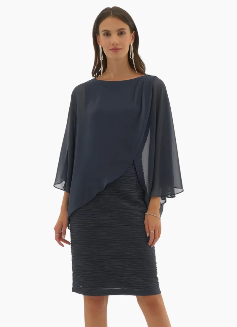 - Midnight from Joseph Ribkoff. This elegant piece combines a soft chiffon overlay with a textured skirt for a refined evening look.