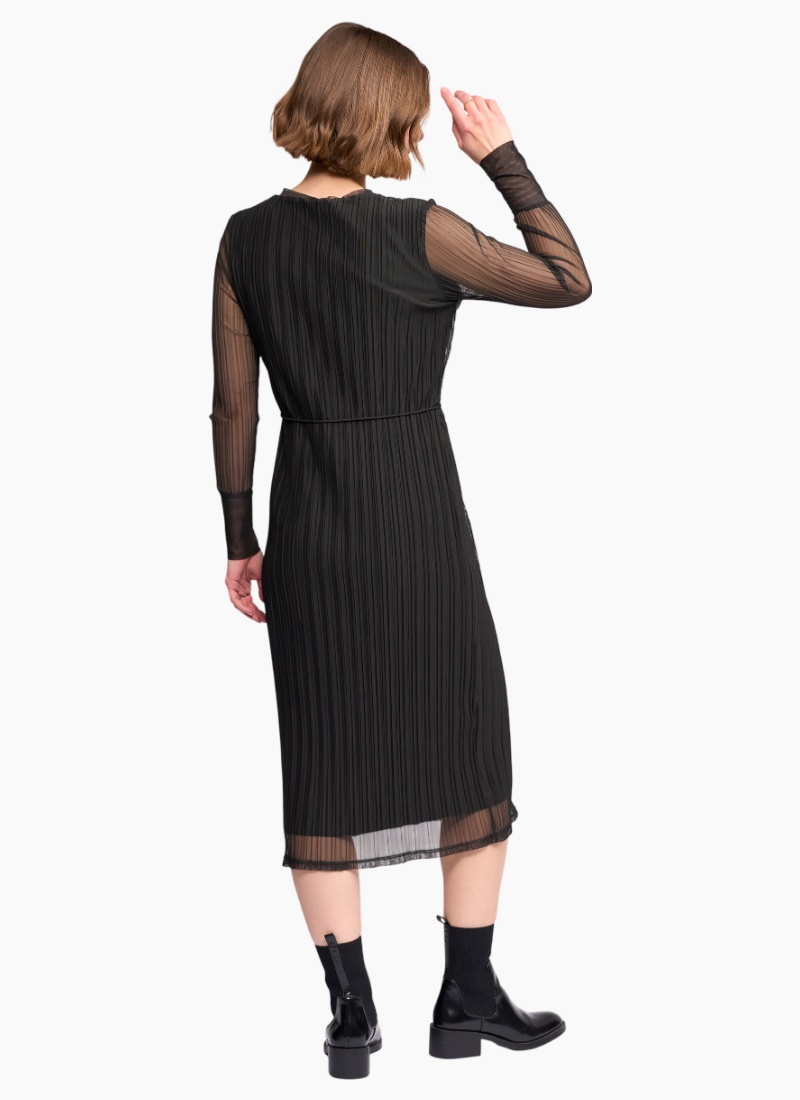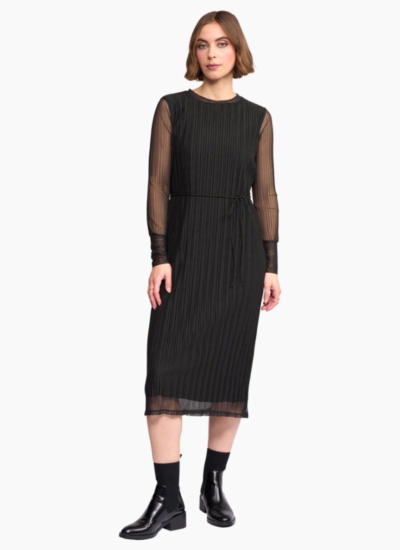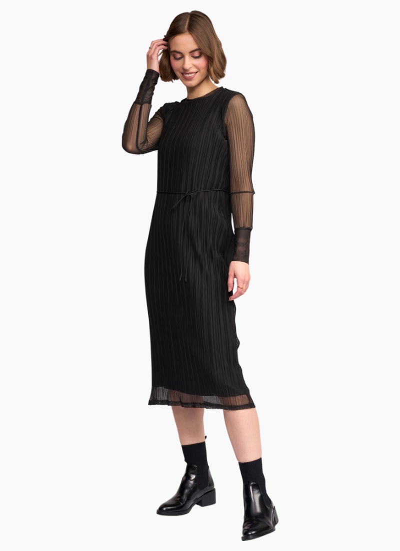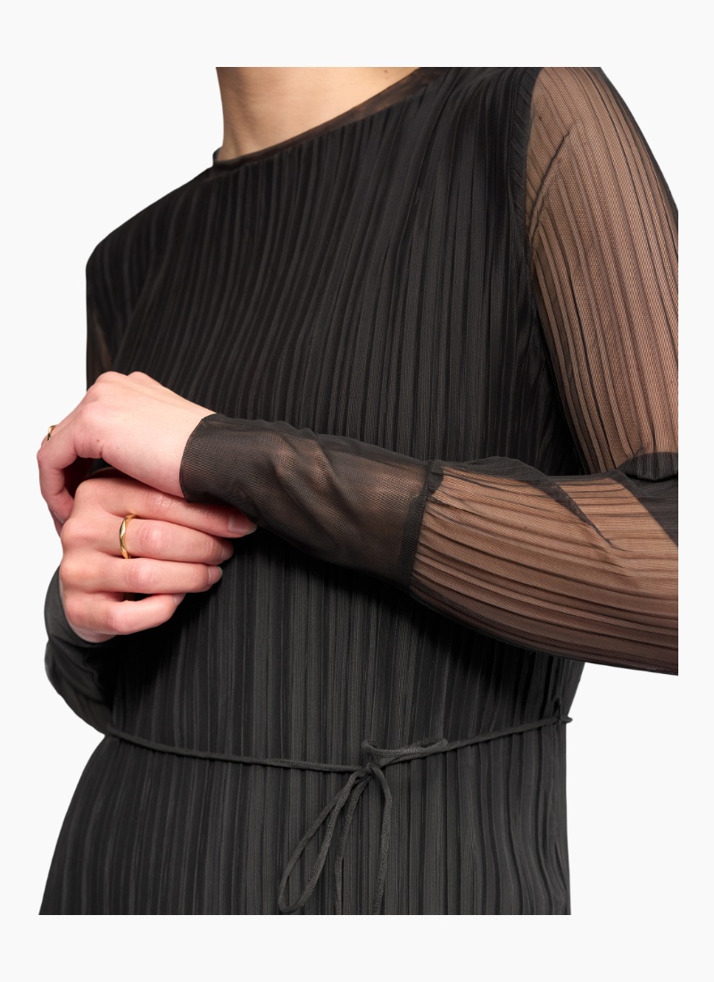 Long sleeve winter dress crafted from a stretchy crinkle mesh in Hunter, adark green. Designed with a slim fit silhouette, round neckline and a matching self fabric waist tie to define the waist, this dress offers an elevated yet effortless winter option. Main: 95% Polyester 5% Elastane. Lining: 95% Rayon 5% Elastane • Made from a stretchy crinkle mesh fabric • Long sleeves with uncrinkled cuffs • Round Neckline • Matching self fabric waist tie • Chainstitched side seam belt loops • Slim fit • Lined body • Model wears size 10, and is 175cm tall