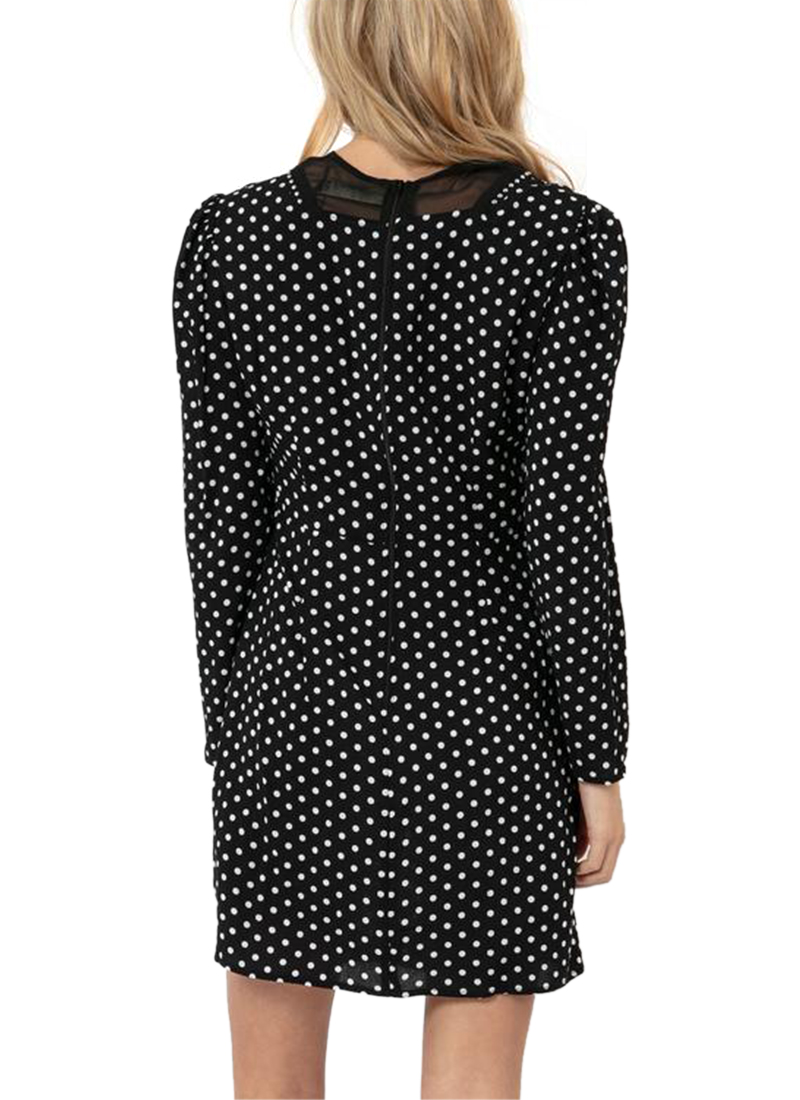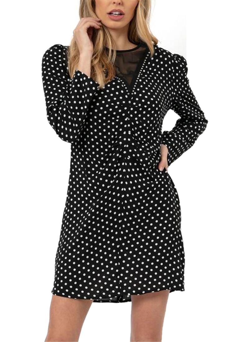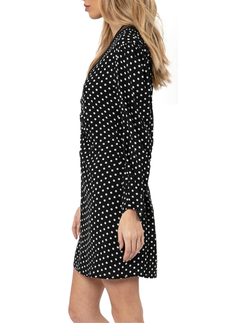 The black and white polka dot 'Interstellar Dress' mini dress is a body skimming shape, with rouched milkmaid long sleeve detail and with pin tucks at the waist. The dress has a mesh V-neck panel and is embellished with a silver stud trim.