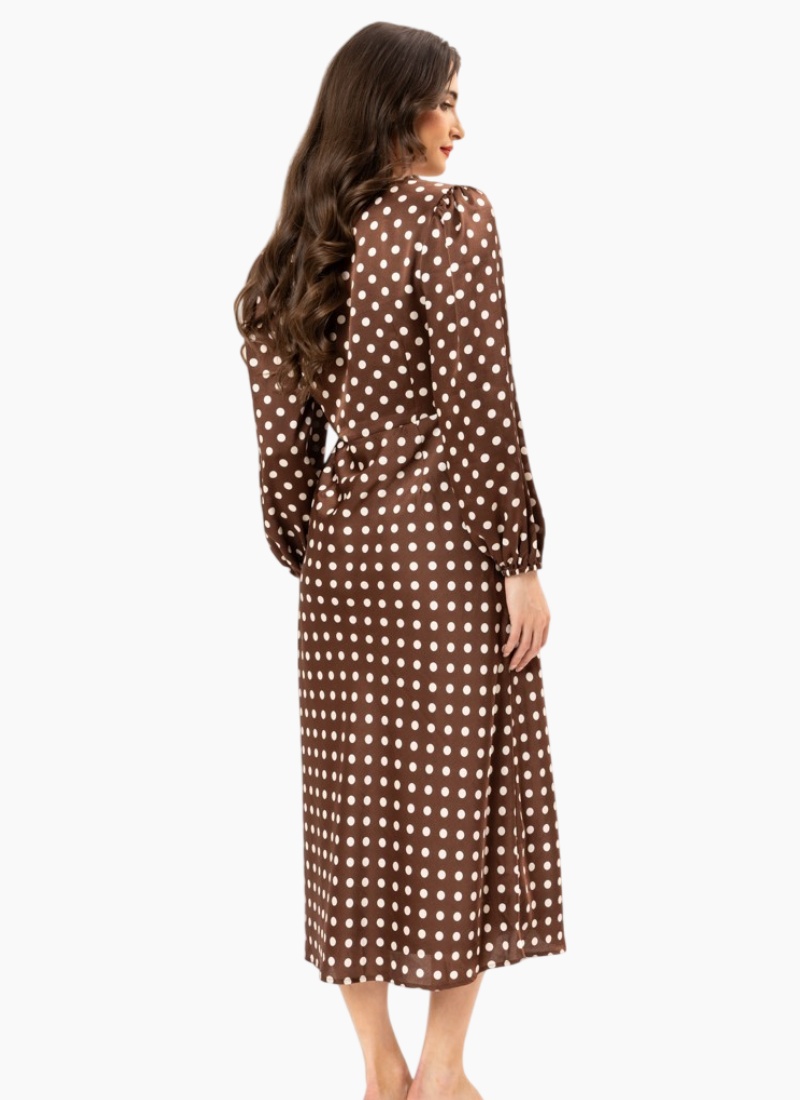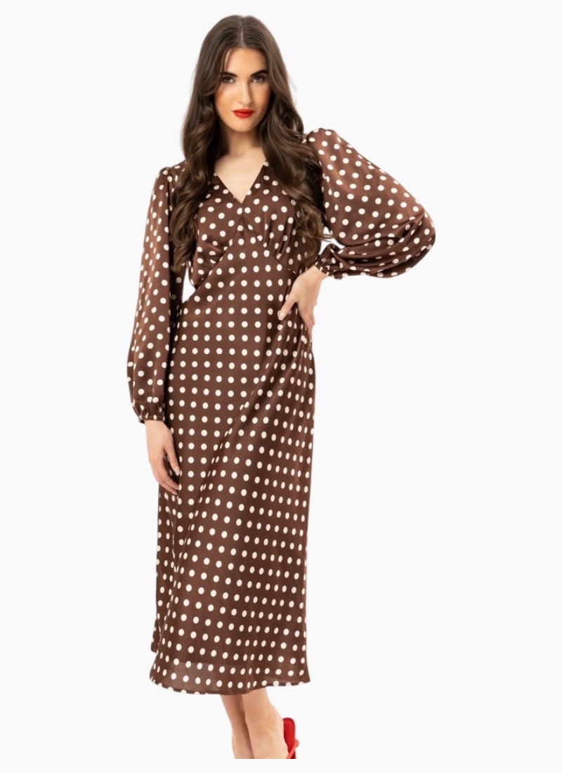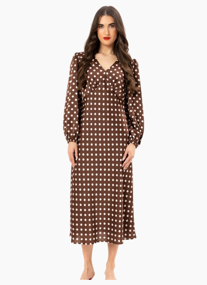 This polka dot midi dress features long sleeves and a V-neckline, creating a stylish and elegant look perfect for any occasion.