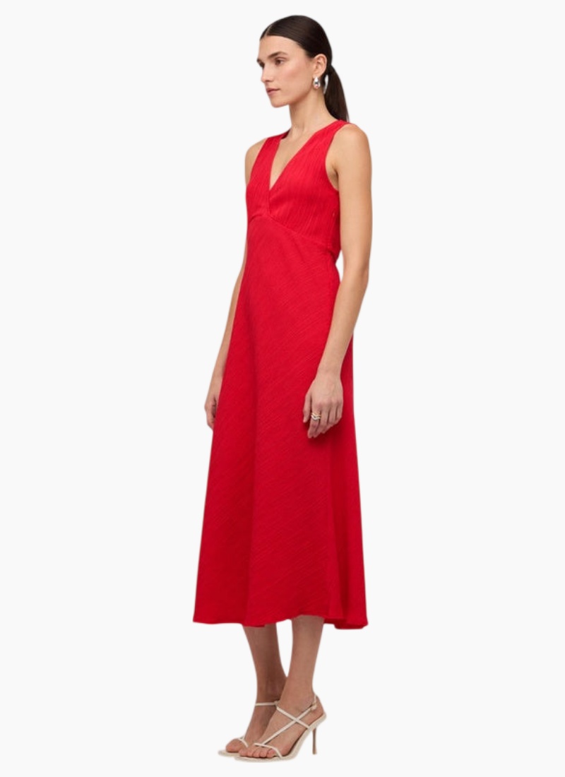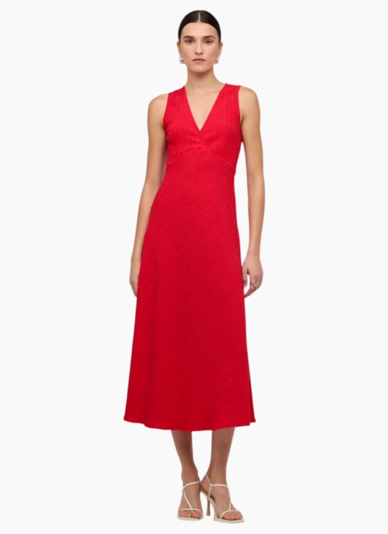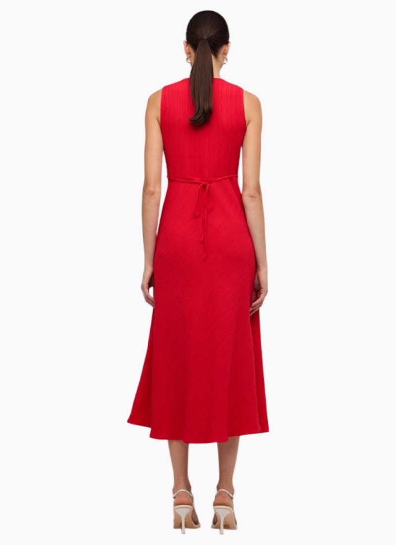 Introducing the Amira Bias Midi Dress from Staple the Label. This elegant red dress offers a refined silhouette perfect for evening events and dressy occasions.