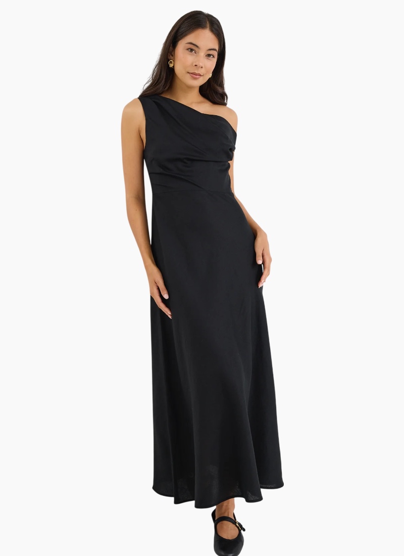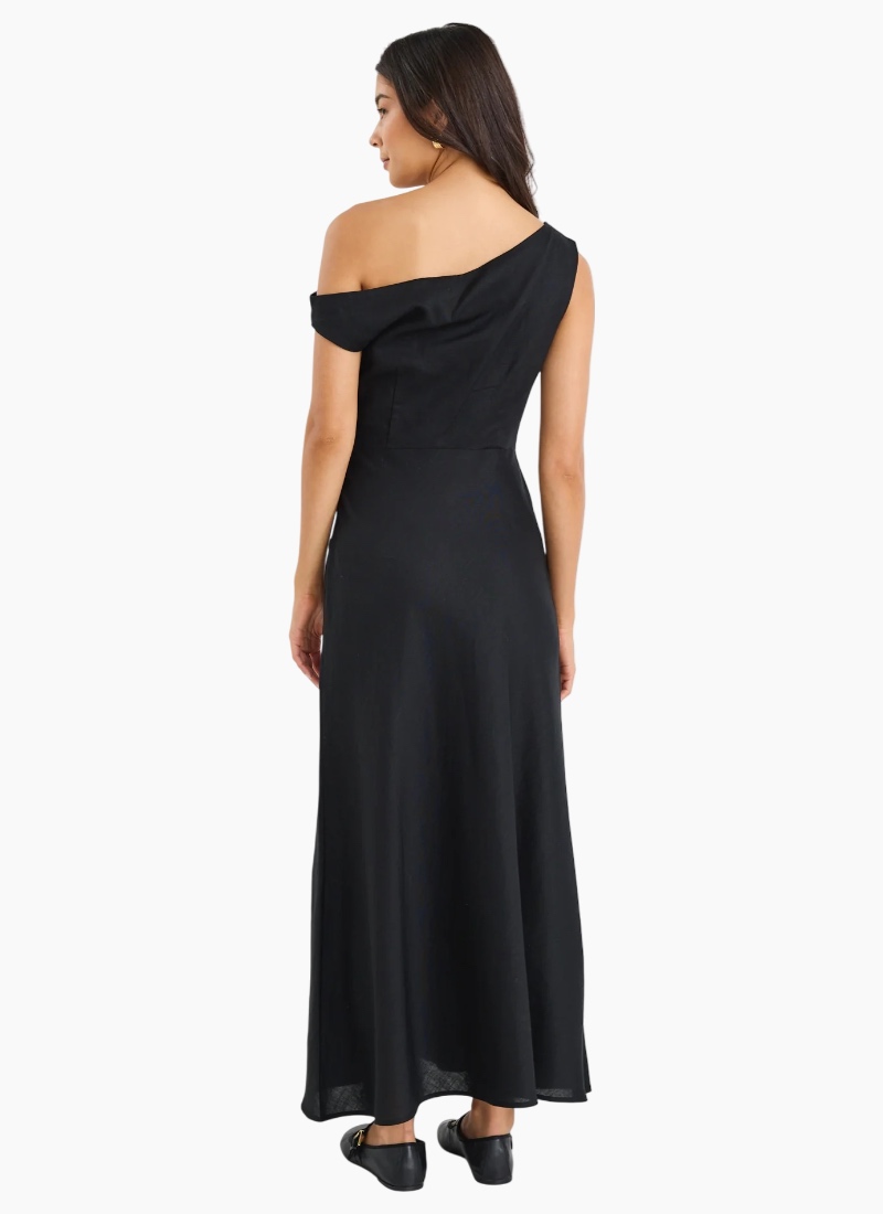 Step into timeless elegance with the Spotlight black linen blend dress. Its one-shoulder design and monochrome floral print make it a standout choice for any special occasion.