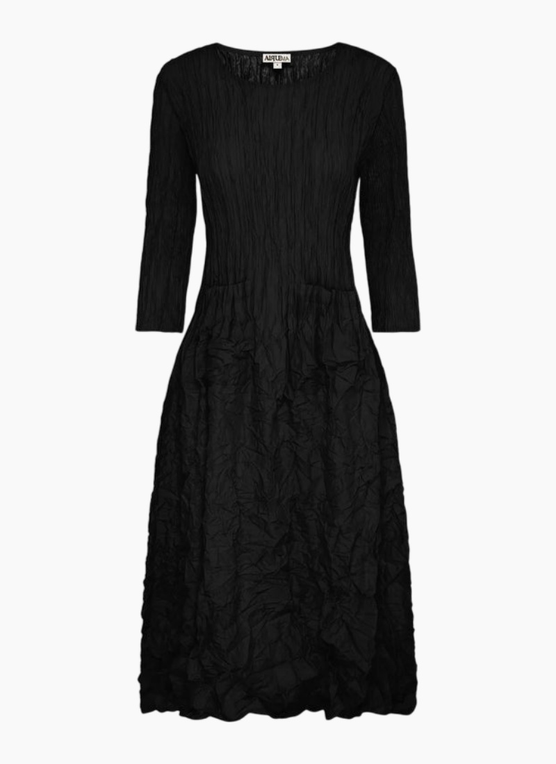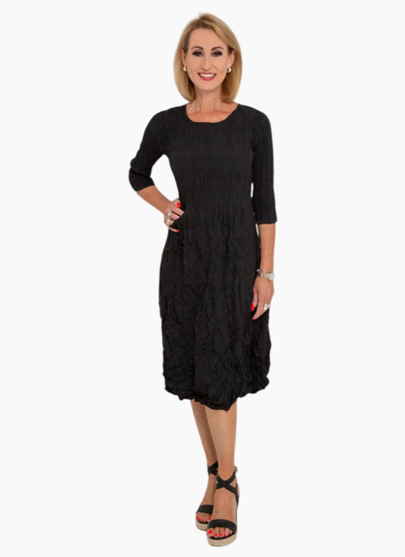 Introducing the Alquema 3/4 Sleeve Smash Pocket Dress in Black by Alquema. A textured maxi dress that pairs practical details with effortless everyday elegance.