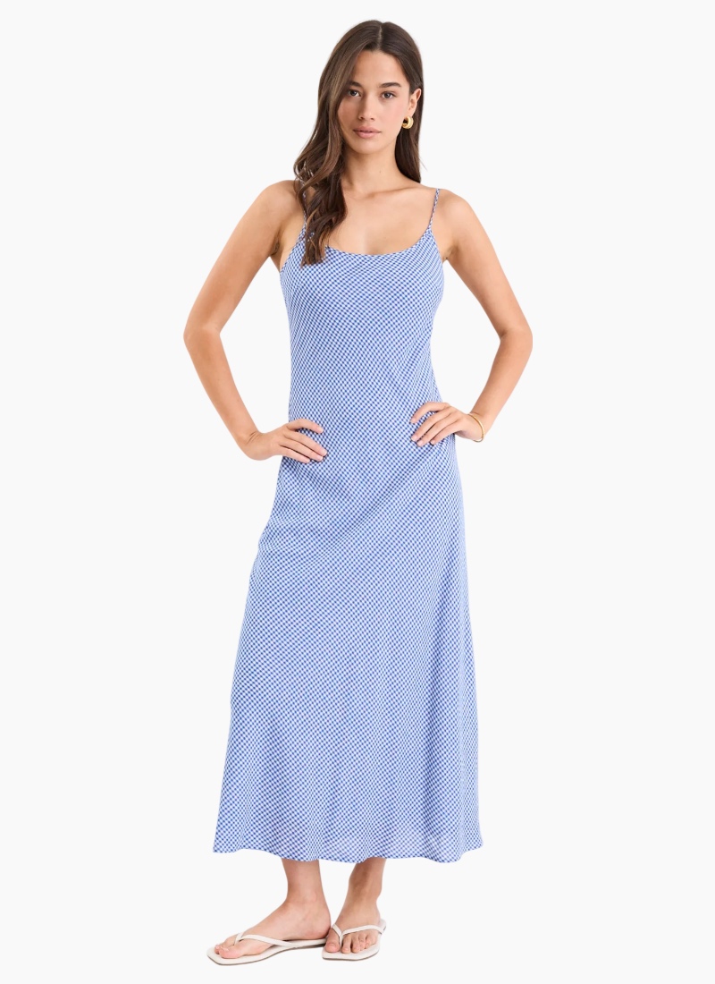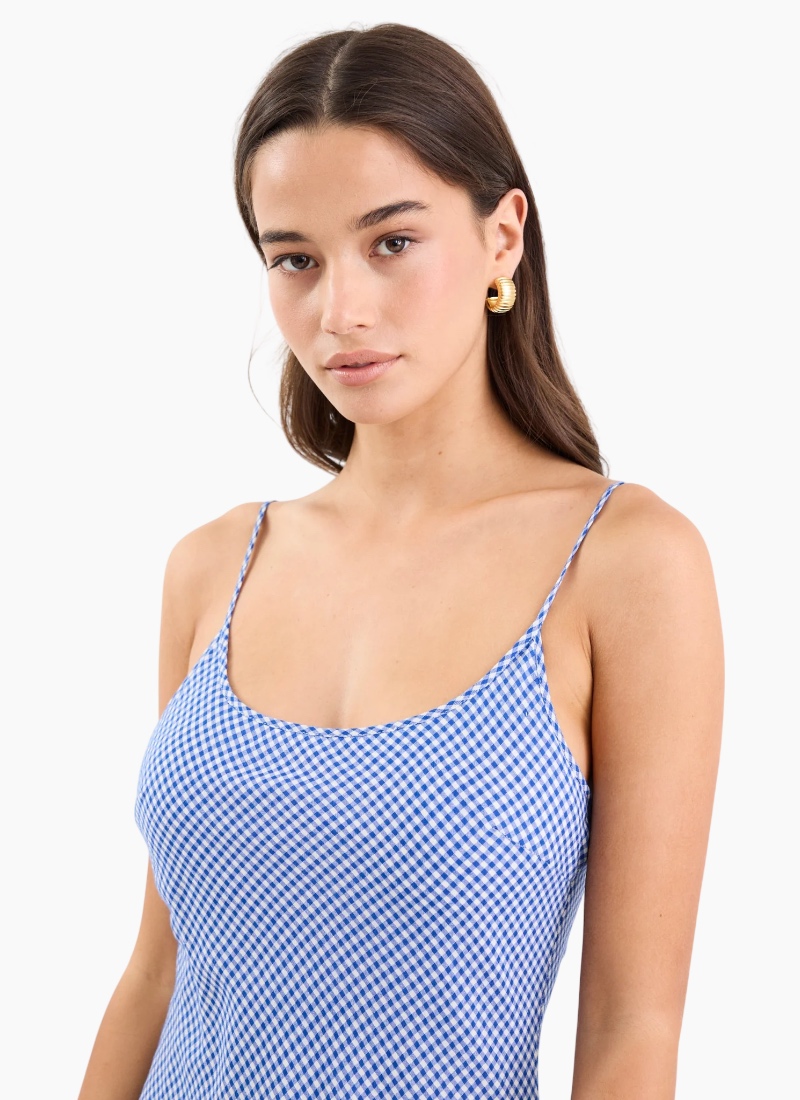 - Blue gingham colourway with delicate spaghetti straps and a flattering scoop neckline