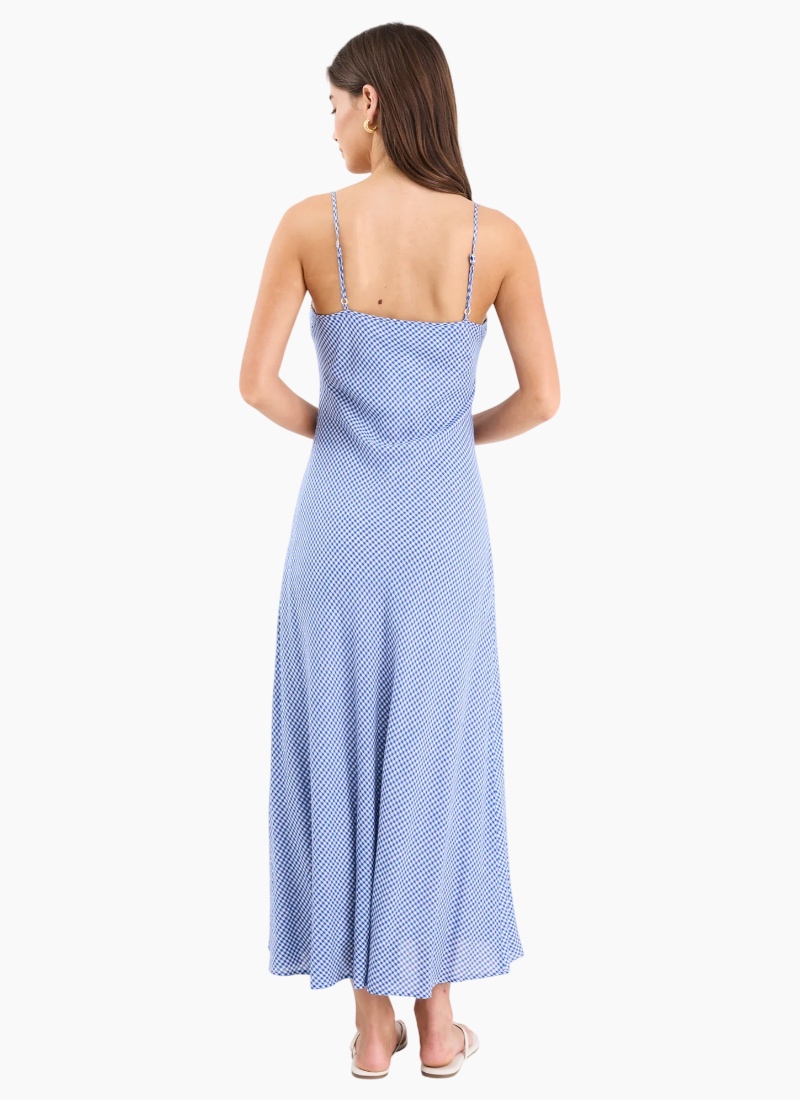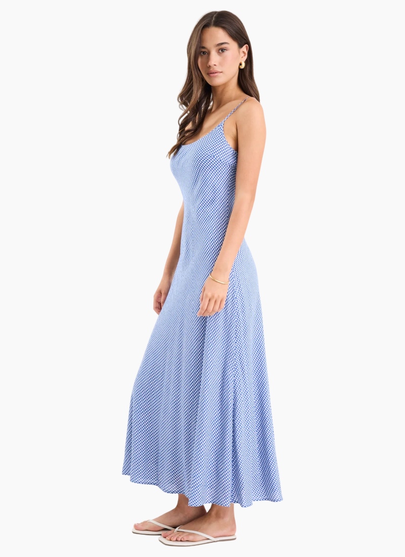 Introducing the Among The Brave Hologram Electric Blue Mini Gingham Strappy Bias Slip Maxi Dress — a breezy, contemporary maxi that celebrates effortless summer style.