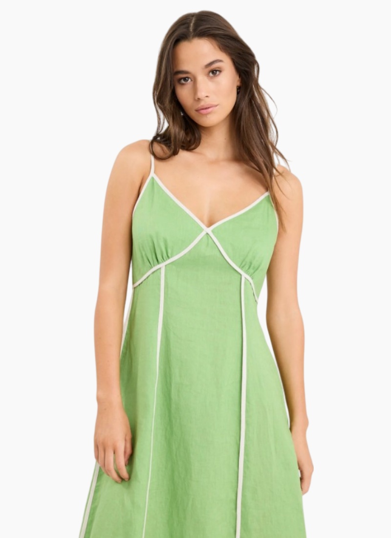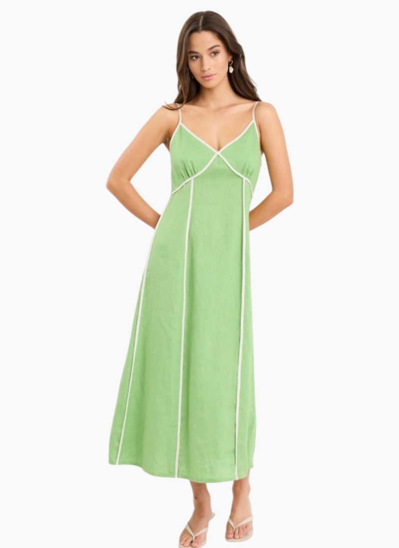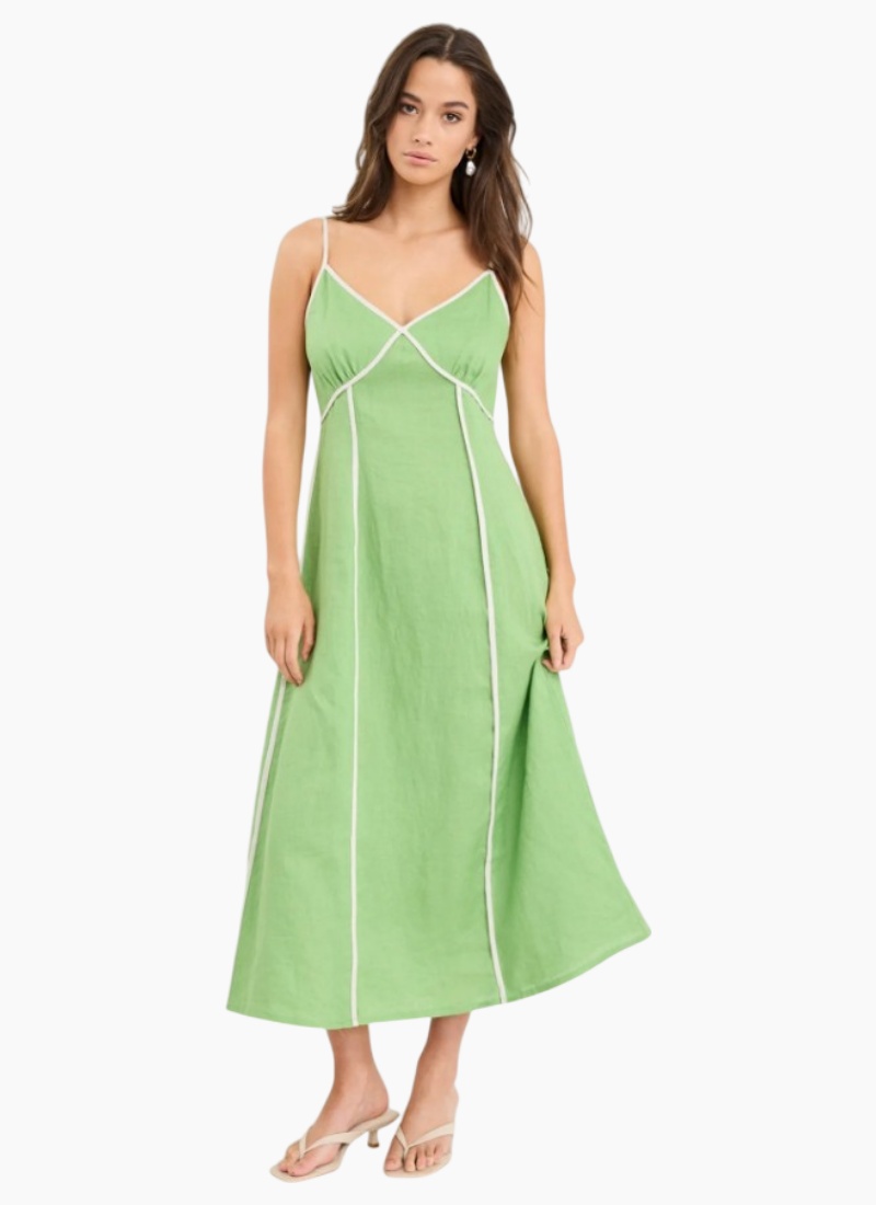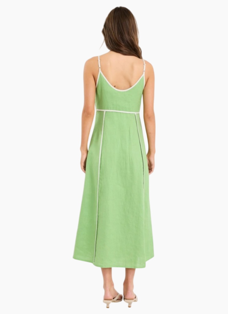 Fresh and striking, the Marine Maxi Dress from Among The Brave features a vibrant apple-green hue contrasted with cream piping details for a modern twist on a classic silhouette. Designed with delicate strappy sleeves and a flowing maxi length, this linen dress is fully lined for comfort and perfect for warm-weather wear.