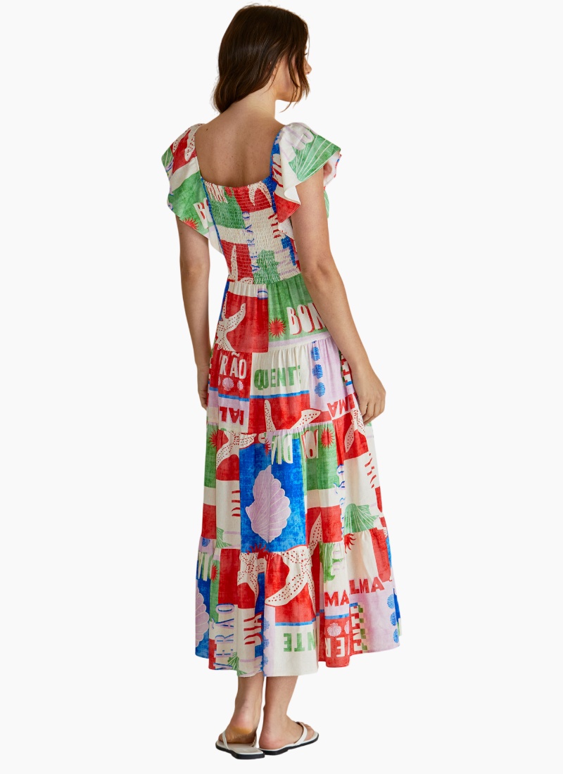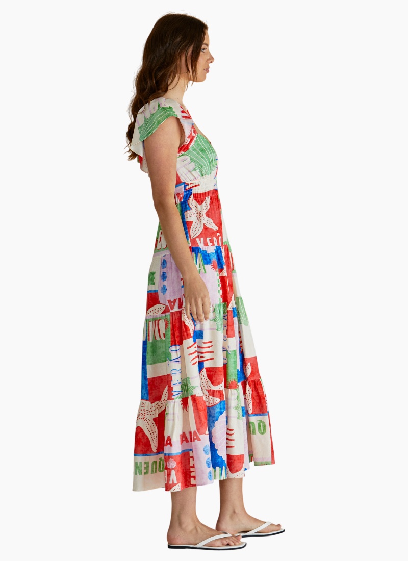 Crafted from lightweight woven fabric with a smooth finish, this dress feels soft and airySweetheart neckline beautifully flatters the décolletage A gently ruched, elastic waist sits just below the bust, creating a flattering and comfortable fit Delicate ruffled cap sleeves add a soft, romantic detail. Tiered A-line skirt flows gracefully from the bust, finished with a frilled hem Falls to a maxi length Viscose/Linen