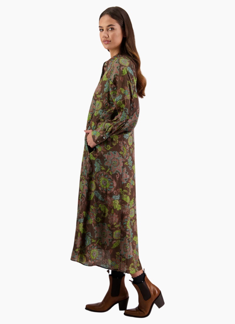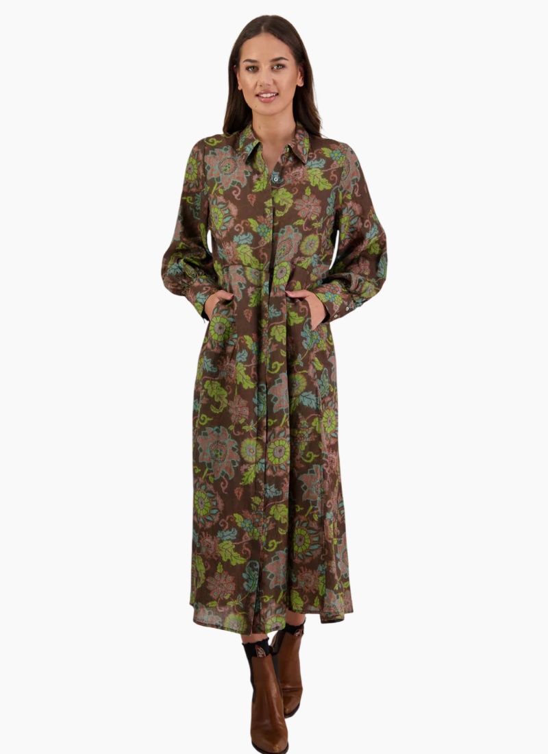 Introducing the Briarwood Hollie Dress Brown Floral. This flowing maxi dress brings vintage-inspired florals and effortless polish to your wardrobe.