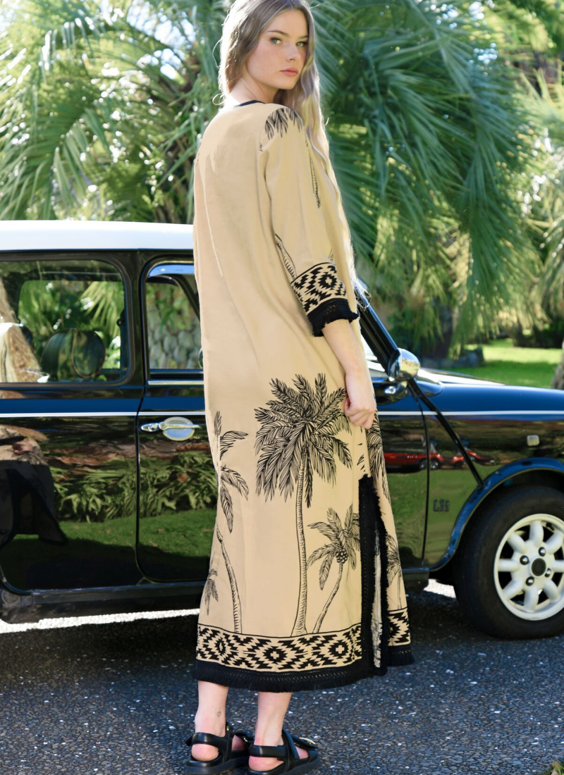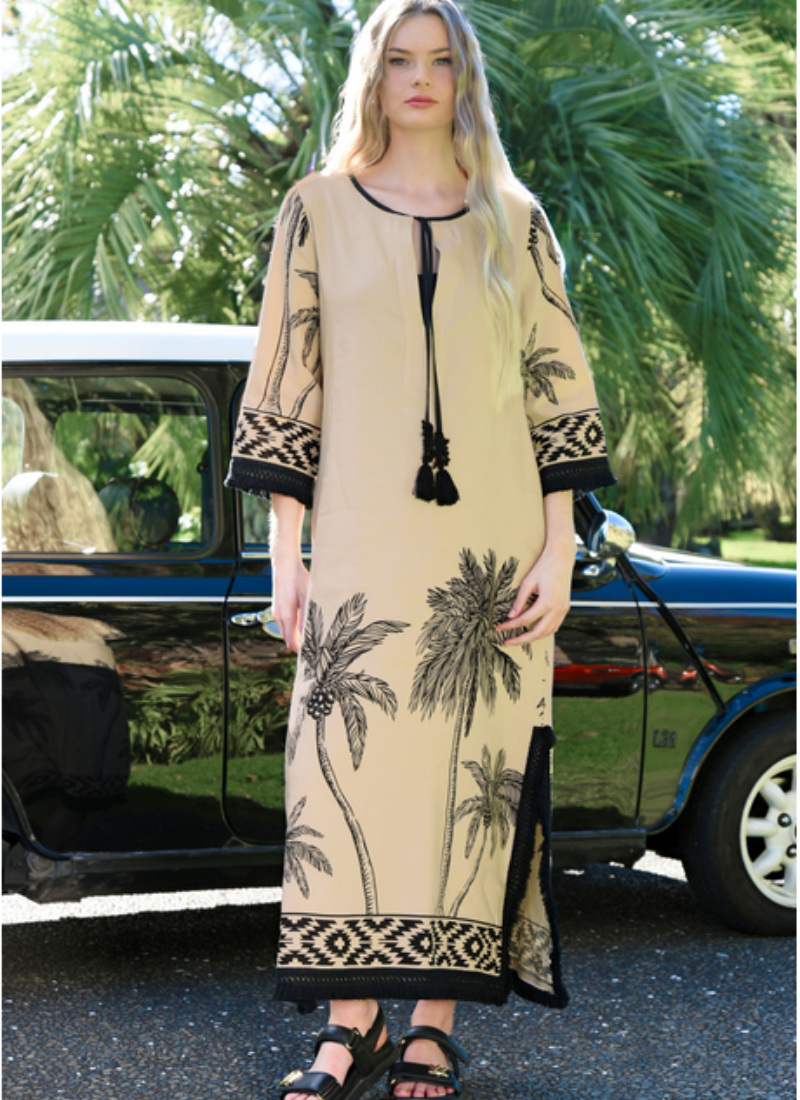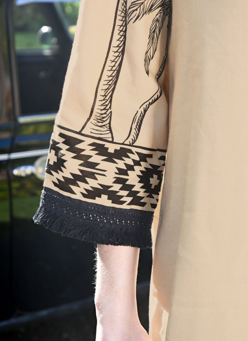 - Sand-tan colour with bold black palm motif and embroidered cuff and hem accents for a statement yet understated look
