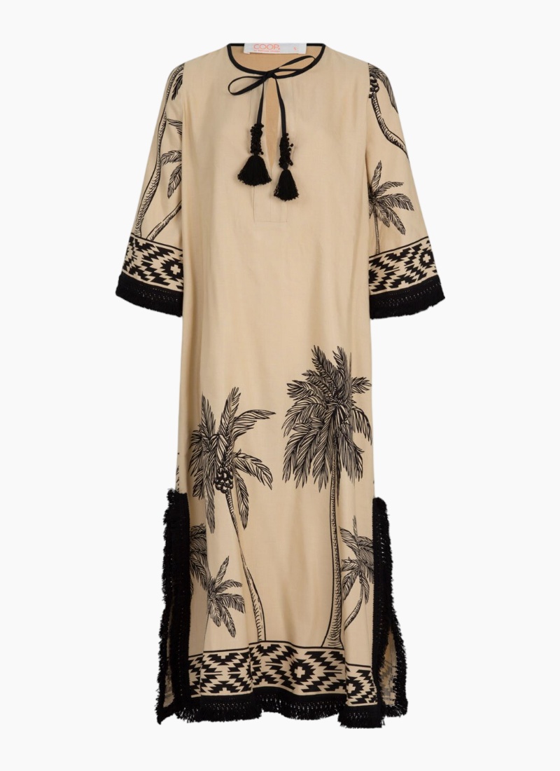 Introducing the A Palm State Of Mind Dress Palm Beach Tan from COOP. This breezy, sun-ready maxi captures a relaxed, coastal mood with palm-print detailing and a tassel-tie neckline.
