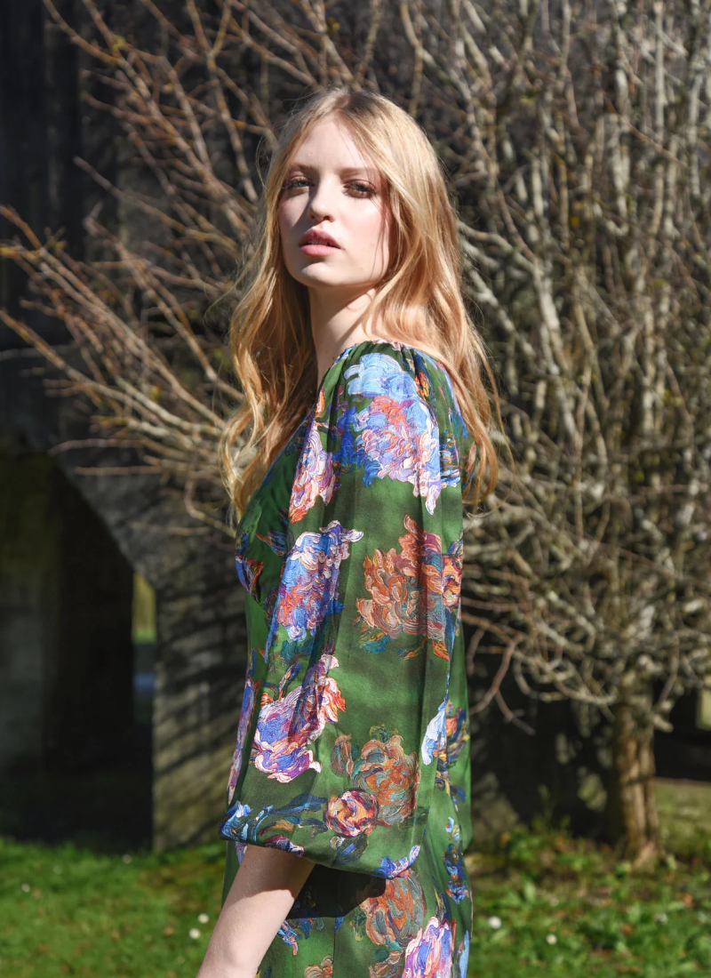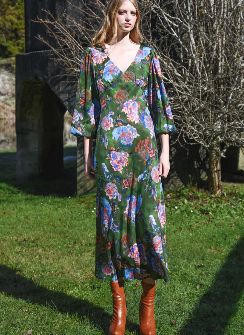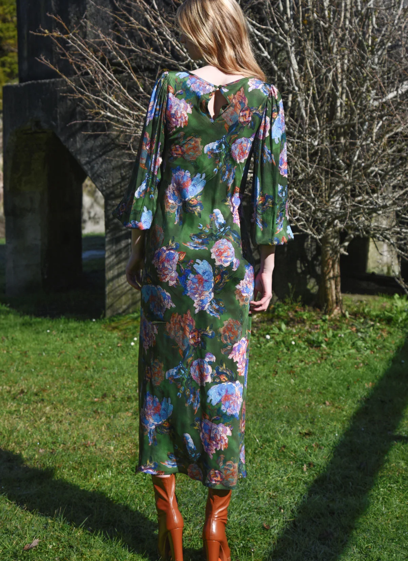 Introducing the I Might Be Biased Dress - Brush Strokes Green from COOP. This painterly maxi brings vibrant florals to a rich green base for an elegant, artful finish.