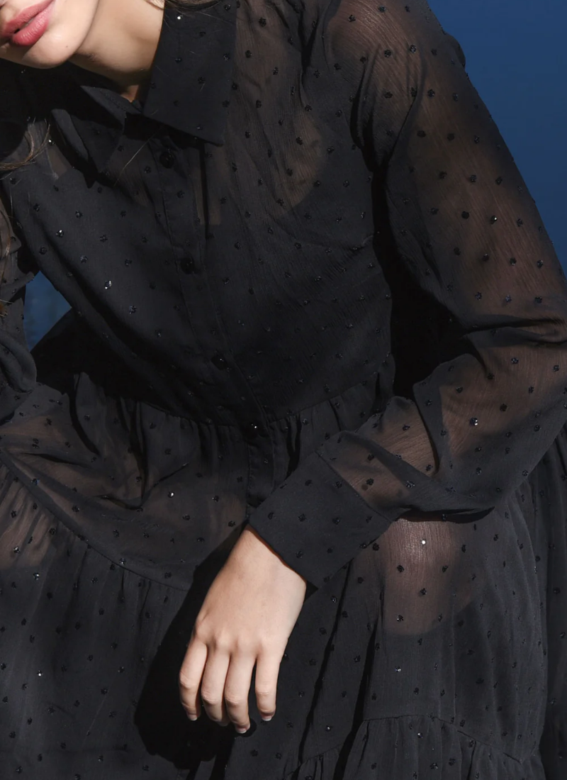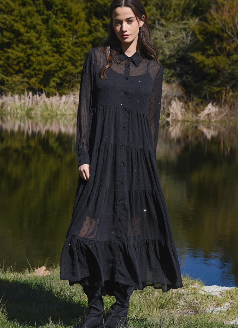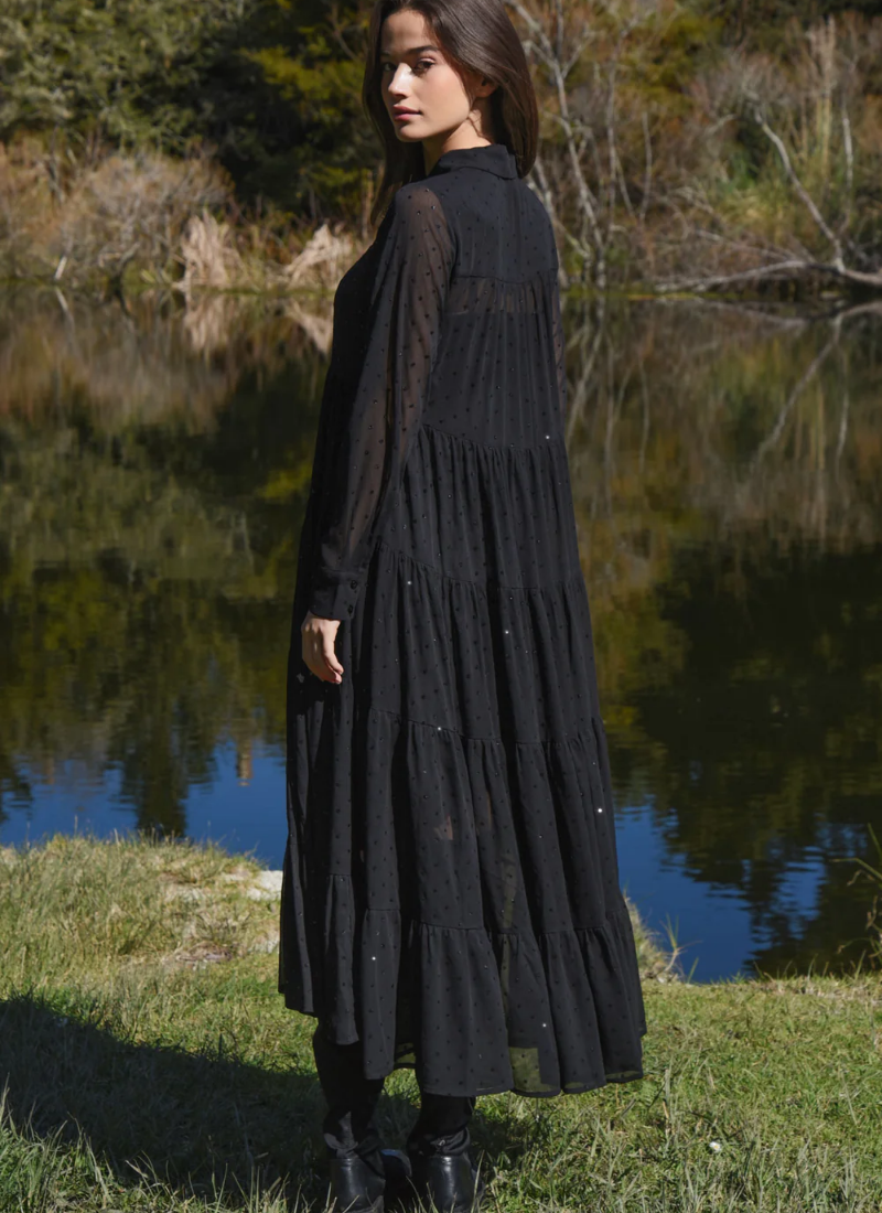Introducing the SUN & THE SWOON Dress - Glitteriti Black from COOP. A black, ankle-grazing maxi dress detailed with delicate glitter dots and a soft, sheer finish.