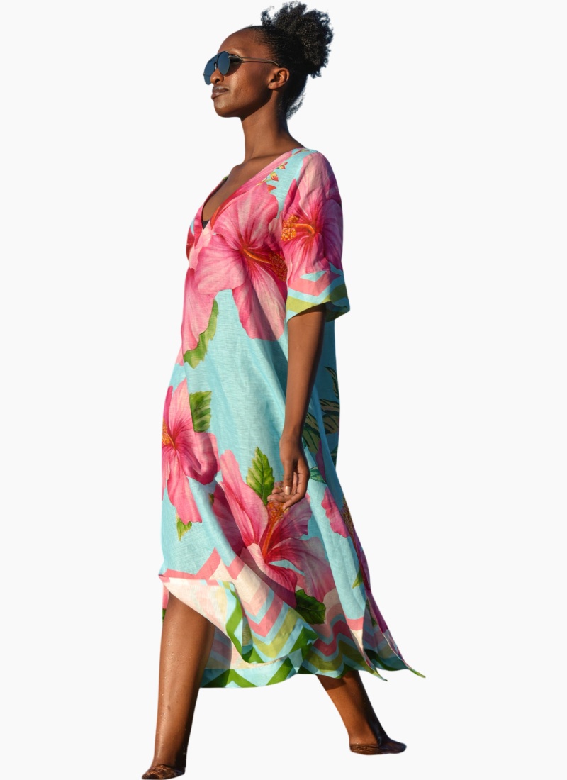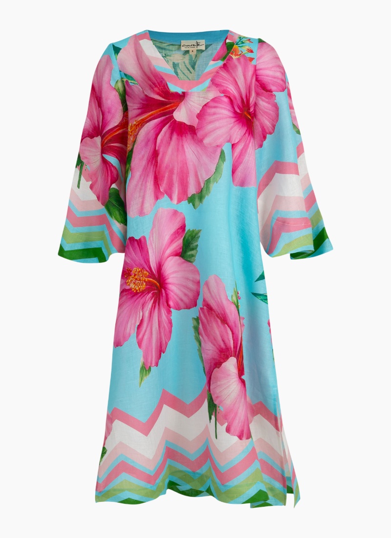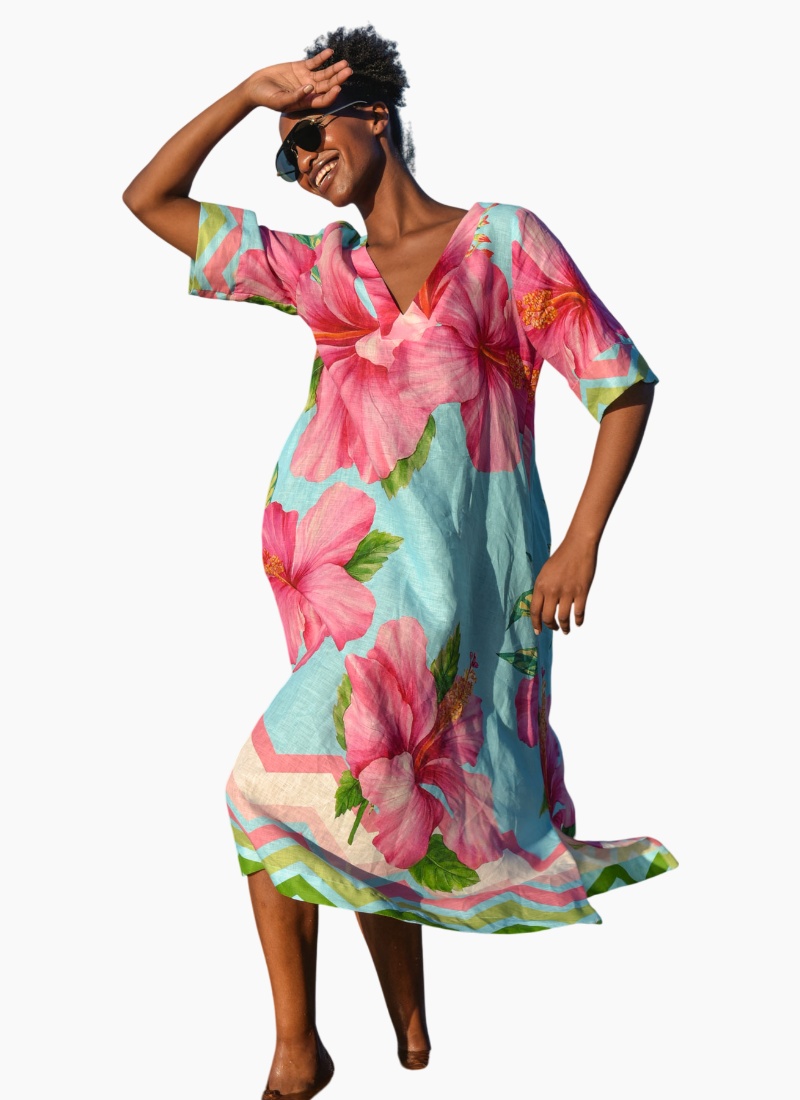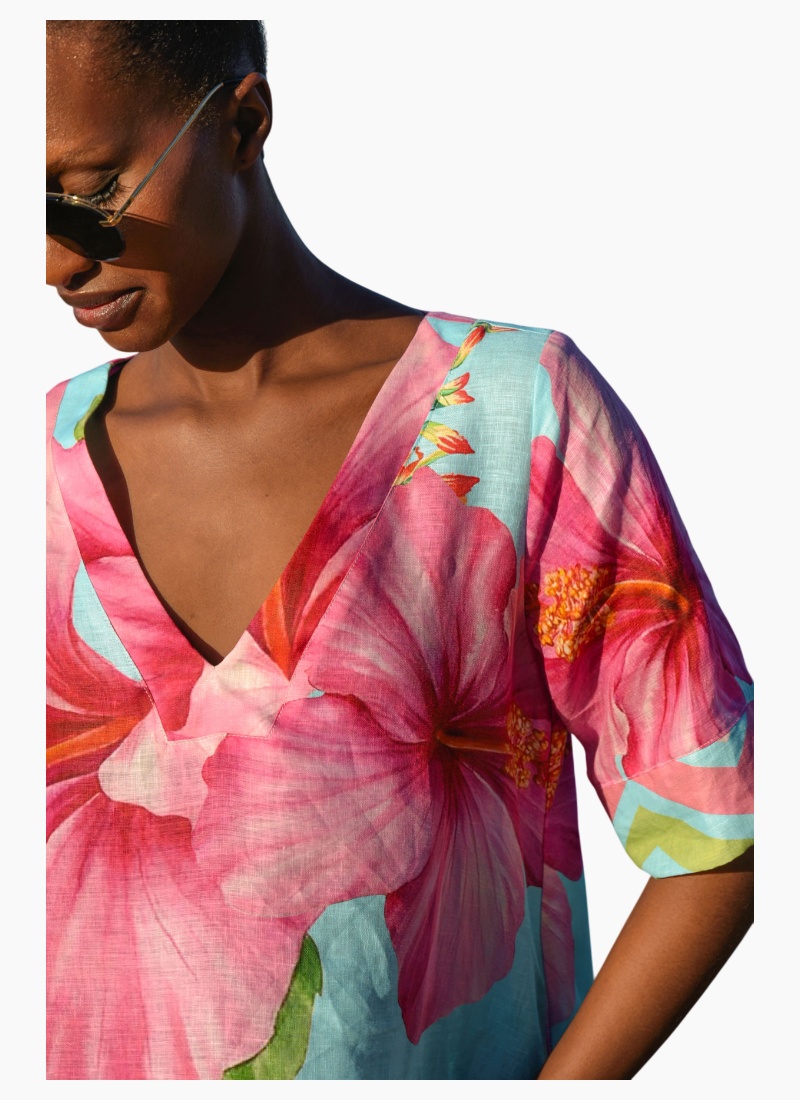 A kaftan silhouette that takes you from work to play, the ‘A Fine Drop’ dress is an all rounder that is a must this summer. Showcasing a brilliantly bright hibiscus print on the comfortable ‘Bloom Town’ linen base cloth, this dress highlights easy summer dressing with a relaxed fit through the body, generous sleeves and a squared off, V-neckline. Pair this with sandals for off-duty weekends or pair it with espadrilles for an elevated touch. • Relaxed silhouette • Squared V-neckline • Short sleeve with deep cuff CT5803-18BLU
