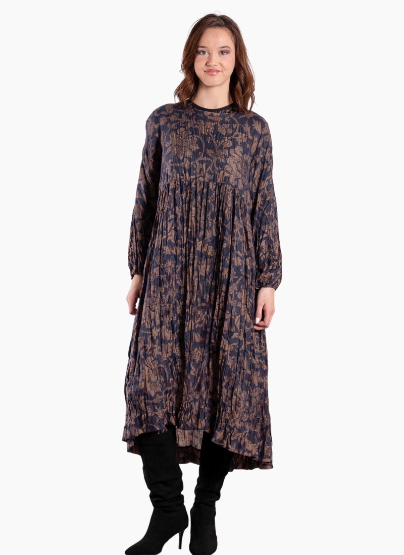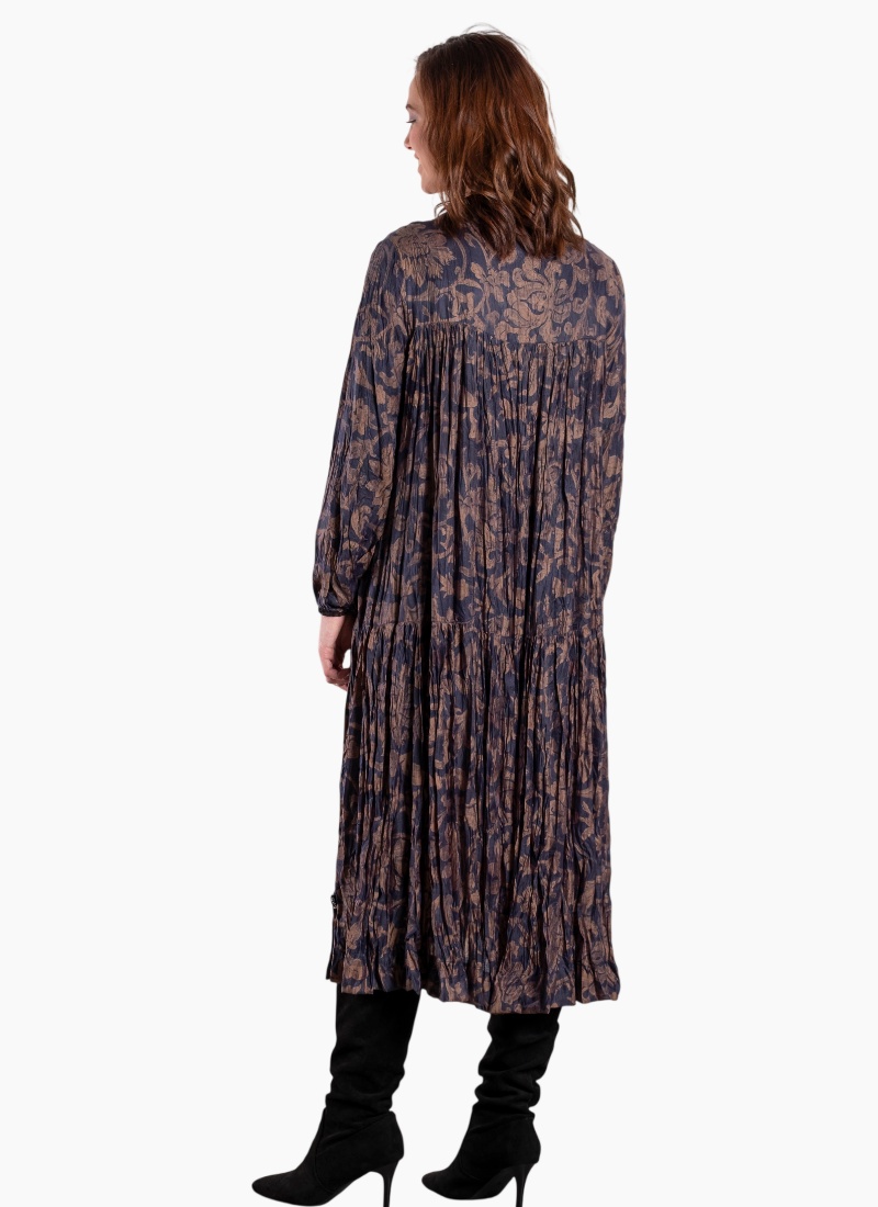 - Rendered in a deep navy blue with warm tan floral motifs, a versatile colourway for day-to-night dressing
