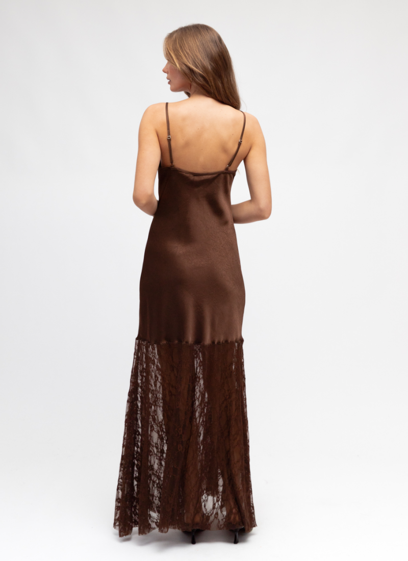 - Crafted from lustrous satin with a sheer lace skirt panel, giving a rich chocolate colour and graceful movement