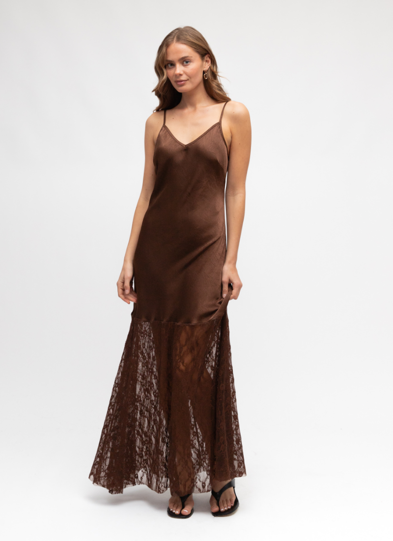 Introducing the Satin Lace Maxi CHOCOLATE from Ebby And I. This luxurious maxi dress marries a satin sheen with delicate lace for an elegant, floor‑skimming silhouette.