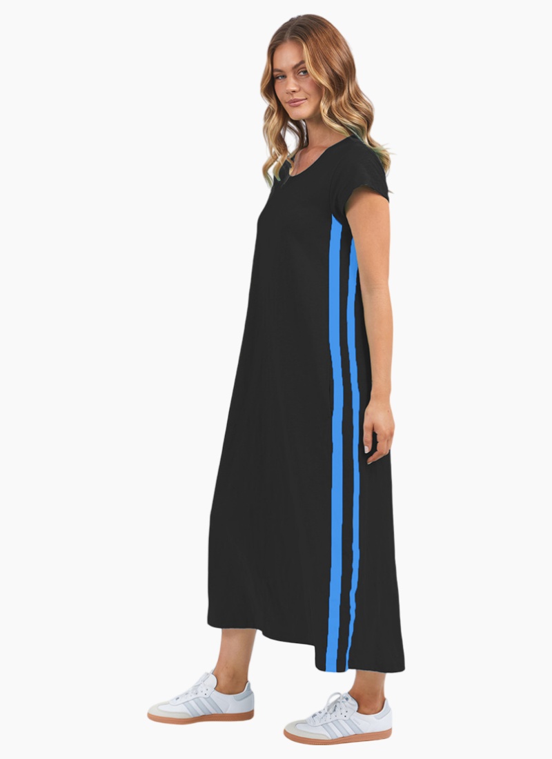 - Designed as a Maxi Dress in a deep black colour with contrasting sky-blue twin side stripes, crafted from soft cotton-jersey for breathable comfort