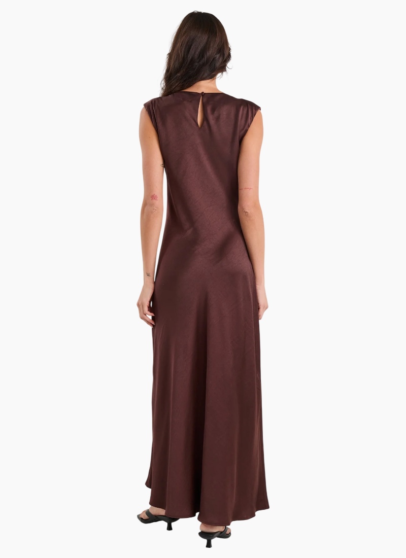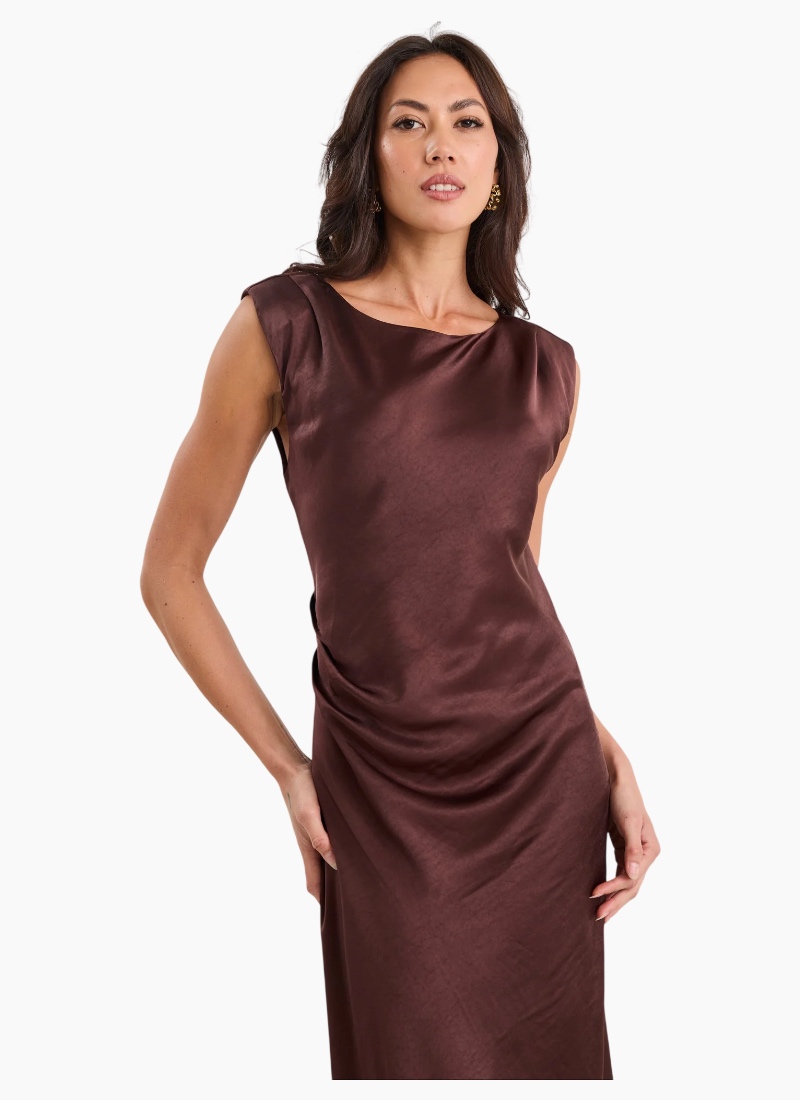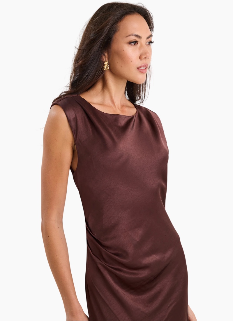 Fruition Chocolate Satin Dress The Fruition Dress is your shortcut to sleek sophistication. Crafted from rich chocolate satin with a fluid bias cut, it drapes beautifully over the body for an effortlessly polished look. Minimalist in design yet high in impact, it’s the kind of piece that instantly elevates your wardrobe with zero fuss. Perfect for high–low dressing, style it with heels for an event or layer it under an oversized blazer for effortless everyday glamour. Features Bias cut for a smooth, flattering silhouette Luxe satin fabric with a soft sheen Sleeveless design with clean, minimal lines Fully lined for added comfort and shape Care: Cold delicate wash recommended