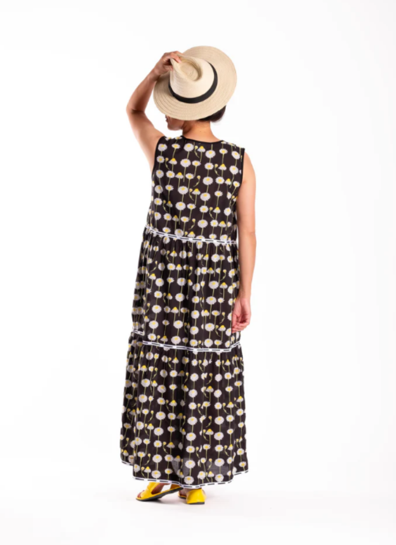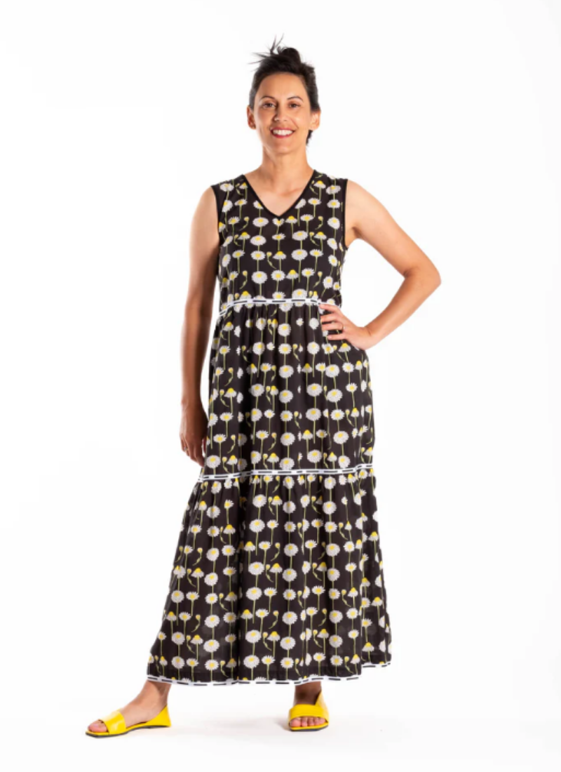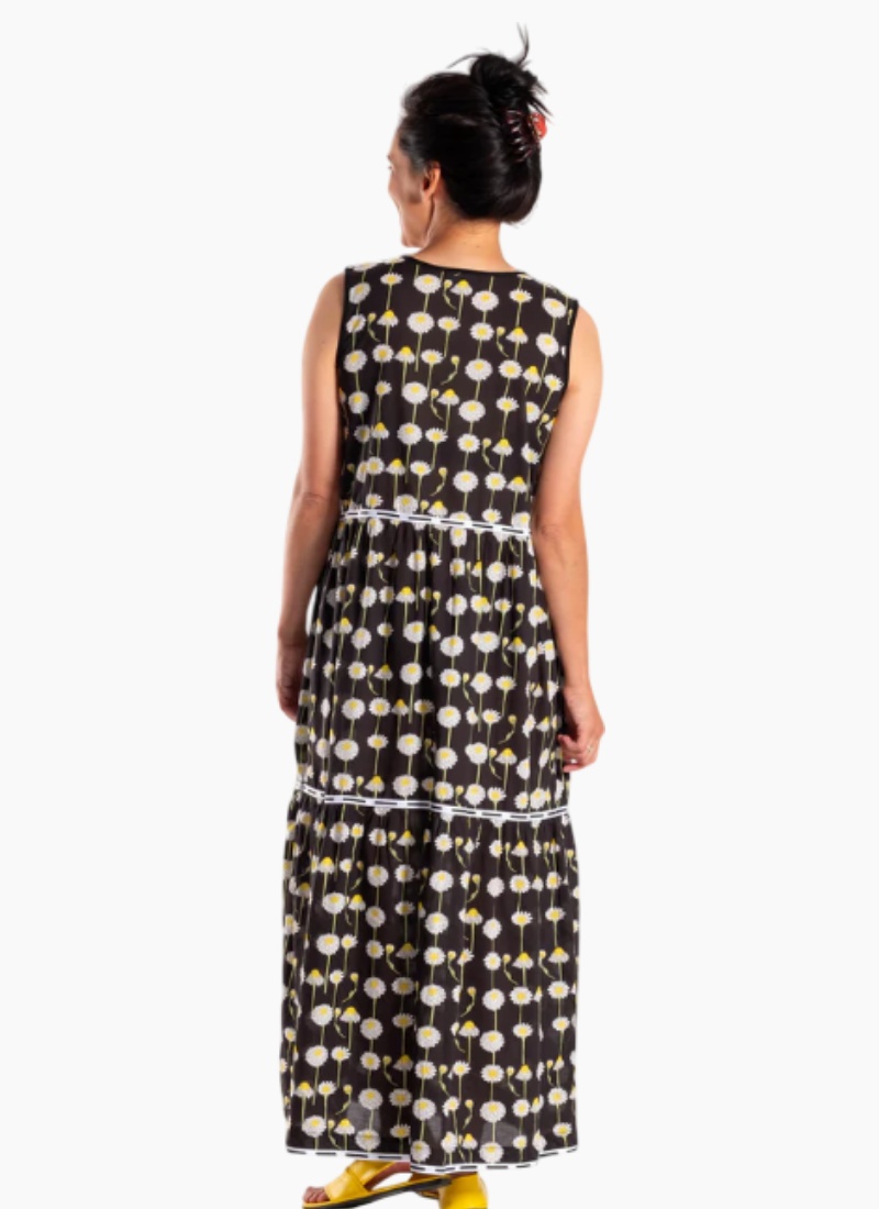 Introducing the Daily Dress Daisy Dress 25-106 from Jellicoe. This breezy maxi dress features a bold black ground scattered with white daisies and sunny yellow centres for a playful, modern look.