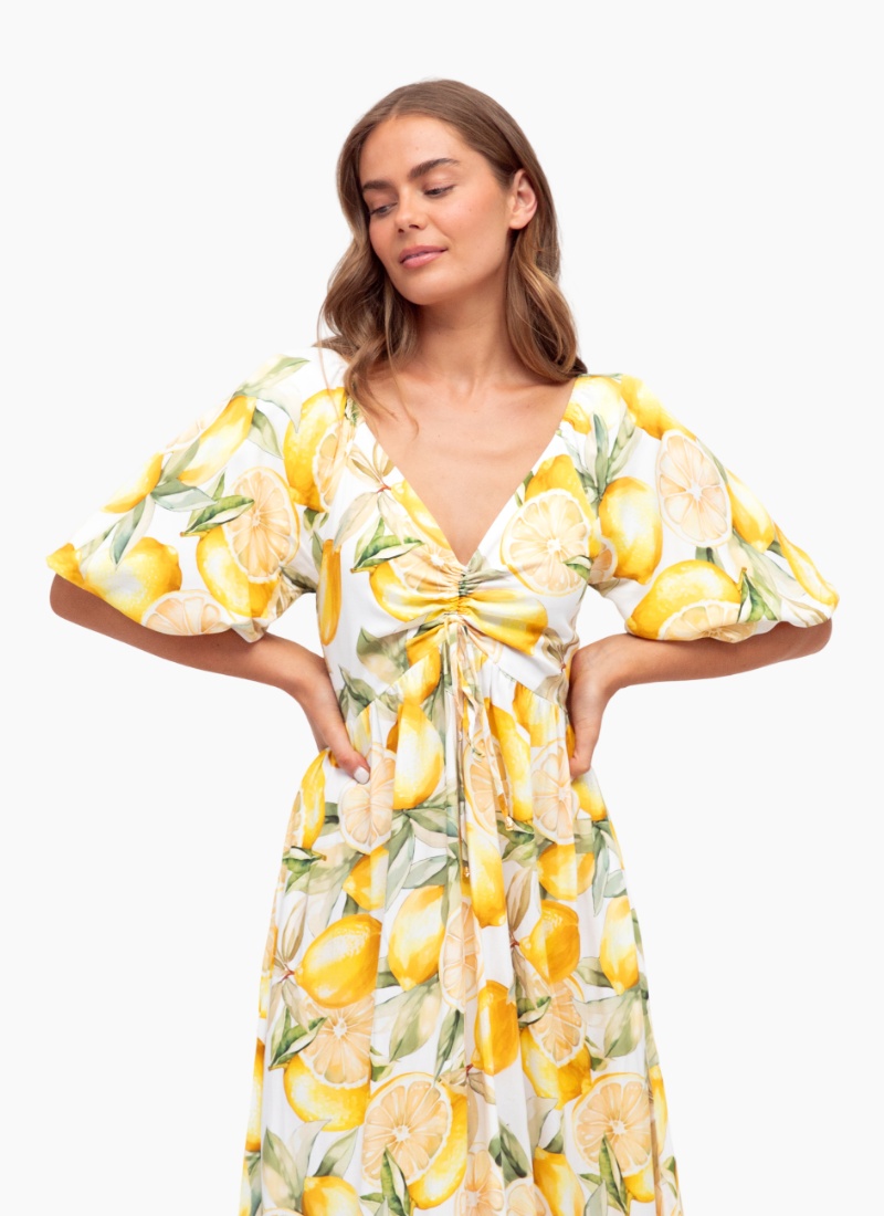 - Vivid yellow lemon print on a fresh white ground adds a burst of colour to any warm-weather edit
