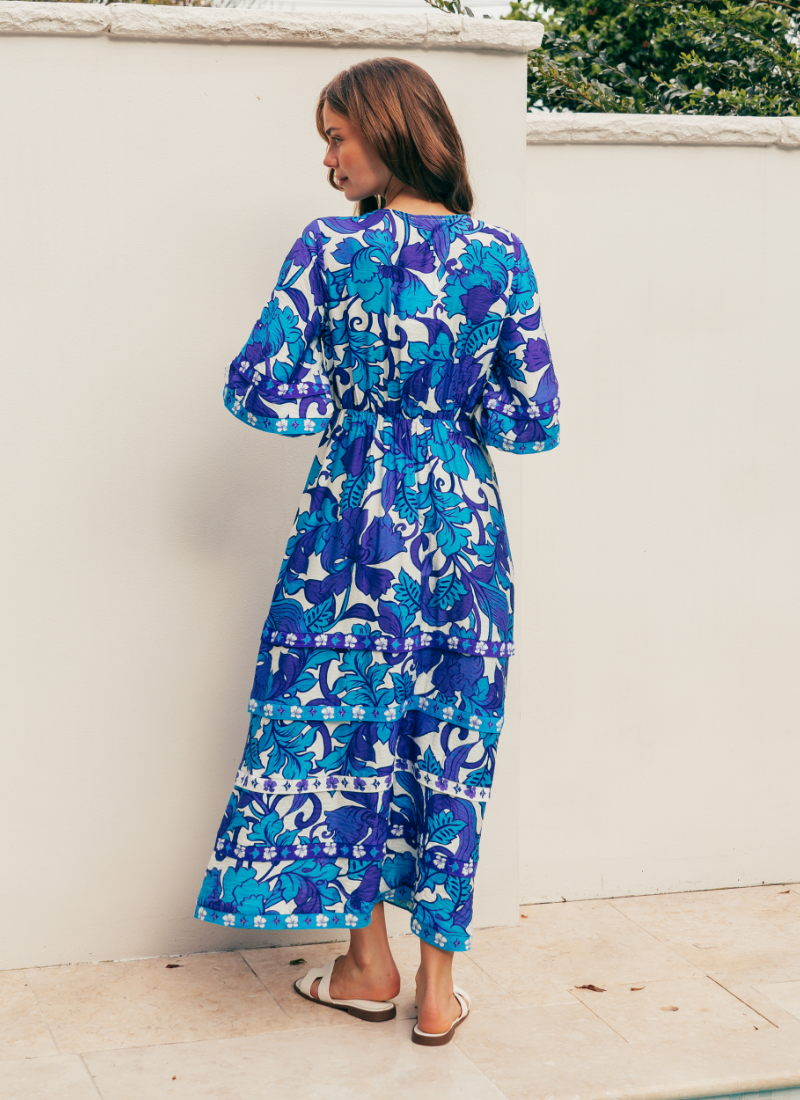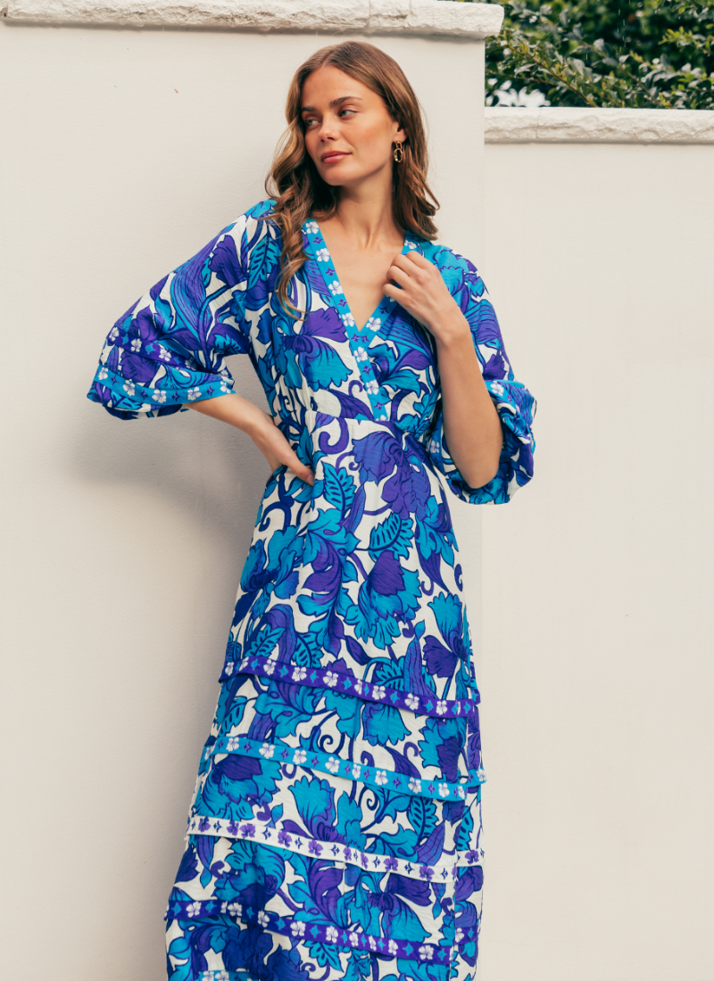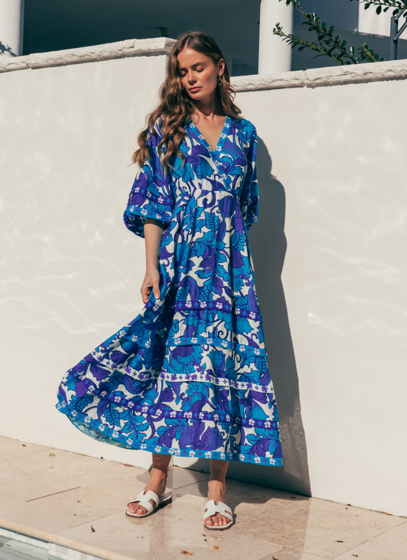 Introducing the Santorini Maxi Dress from Label of Love. This flowing maxi dress captures sun-drenched holiday vibes with a bold blue floral print and easy, feminine movement.